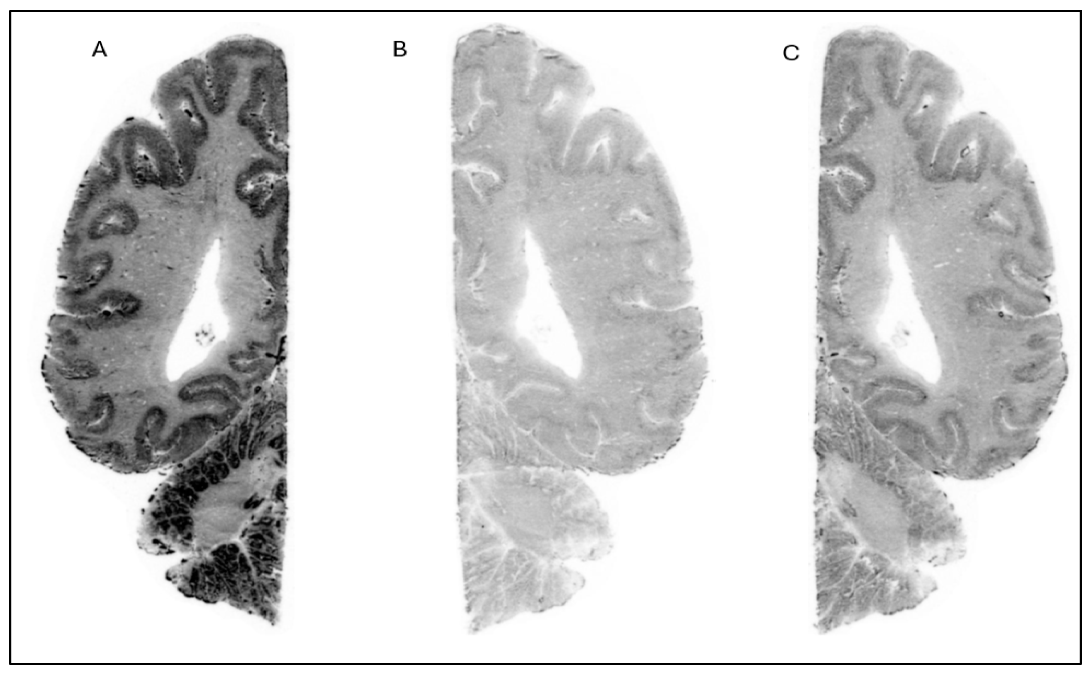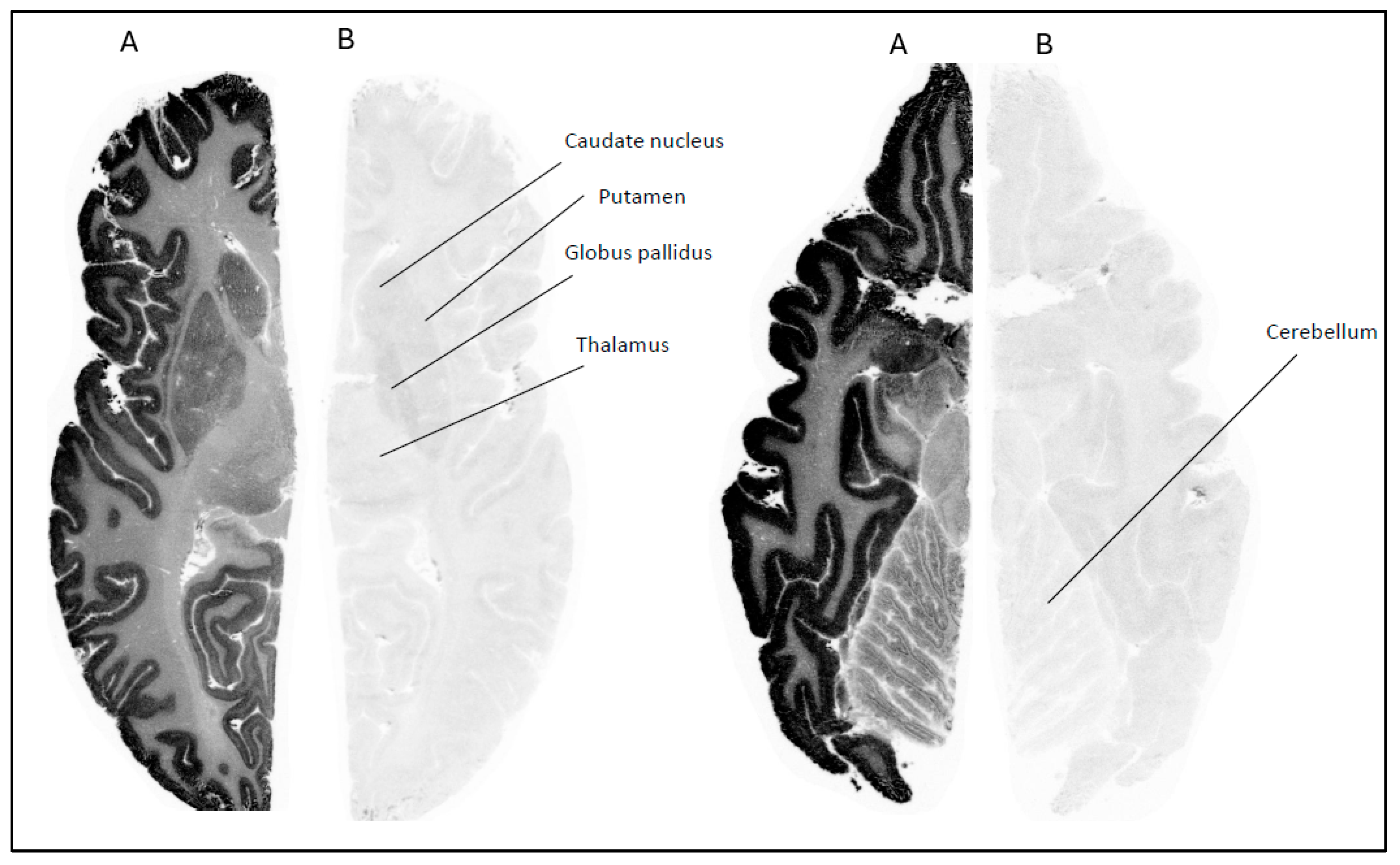 In case of NHP brains, fresh frozen post-mortem tissue was sectioned on a cryomicrotome (Leica CM 1860 Leica, Nussloch, Germany), thaw mounted to poly-l-lysine-treated glass plates, dried at room temperature and stored at −20 °C until use. The thickness differed from human tissue (20 µm).