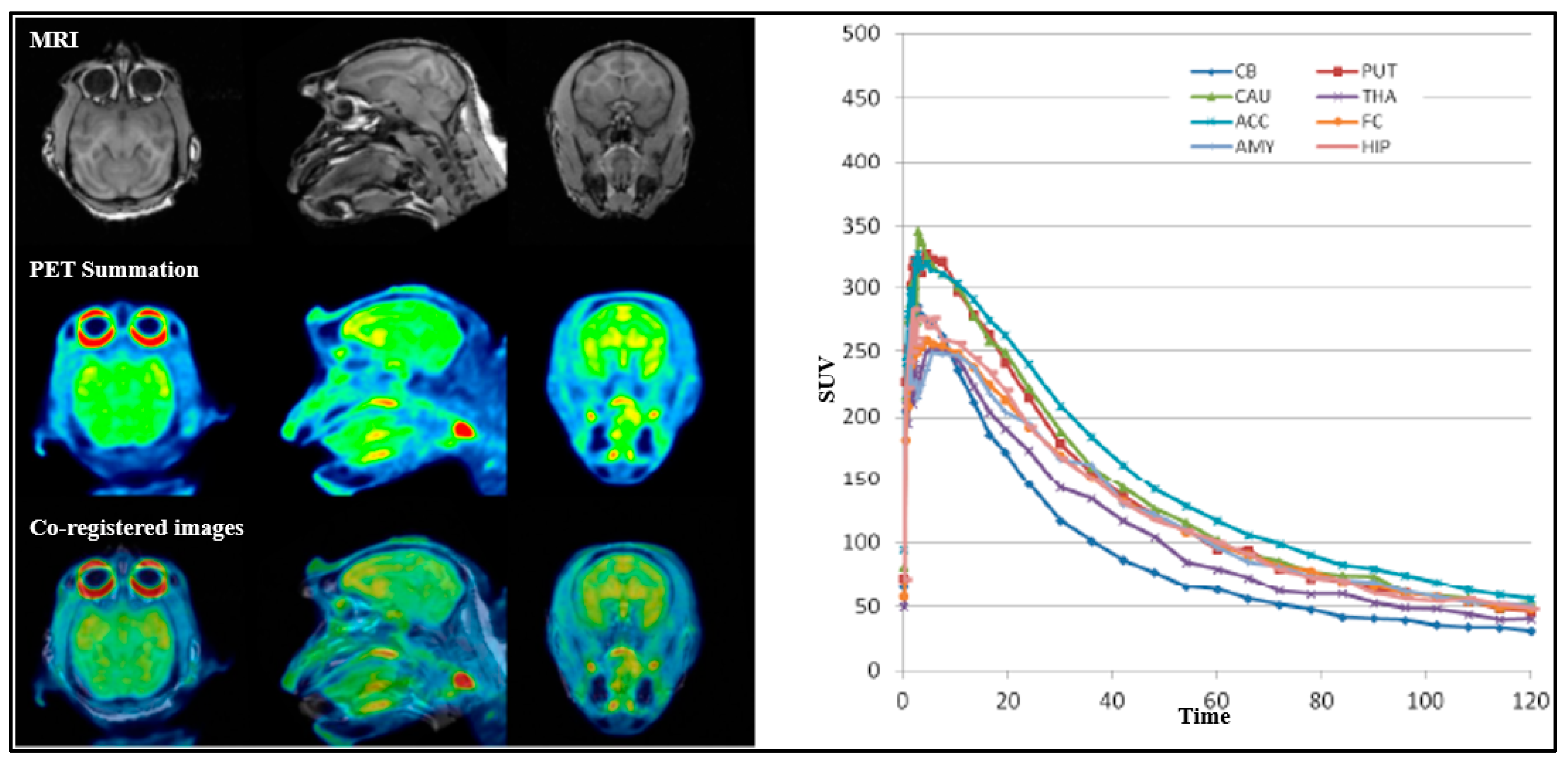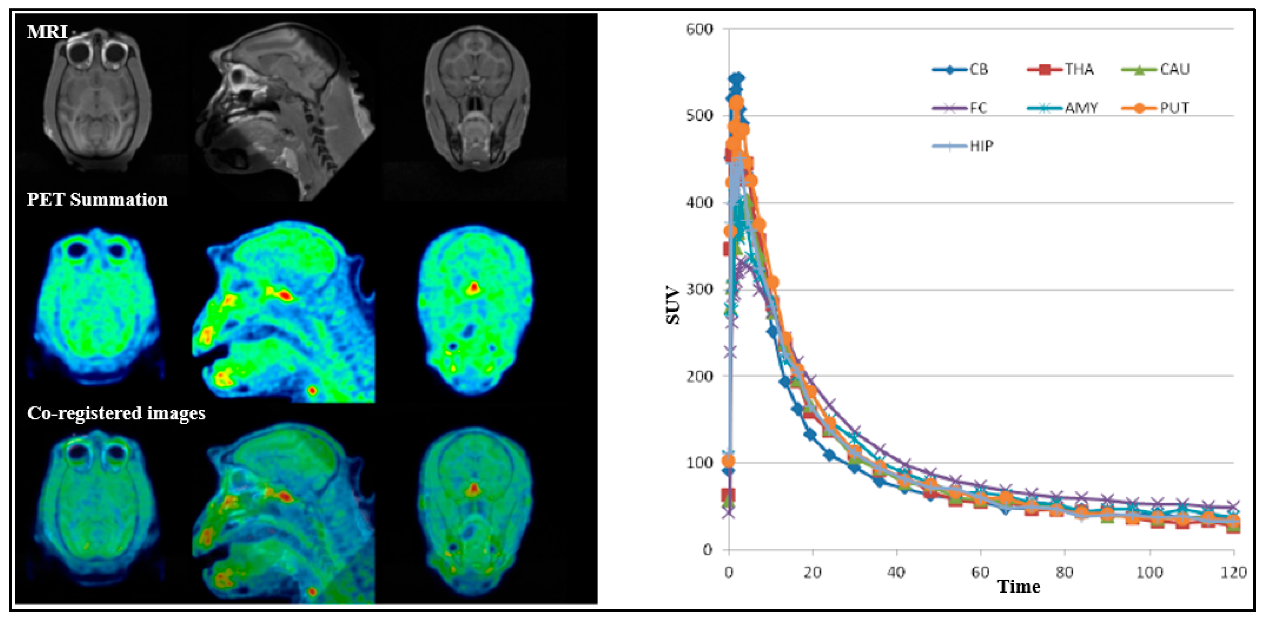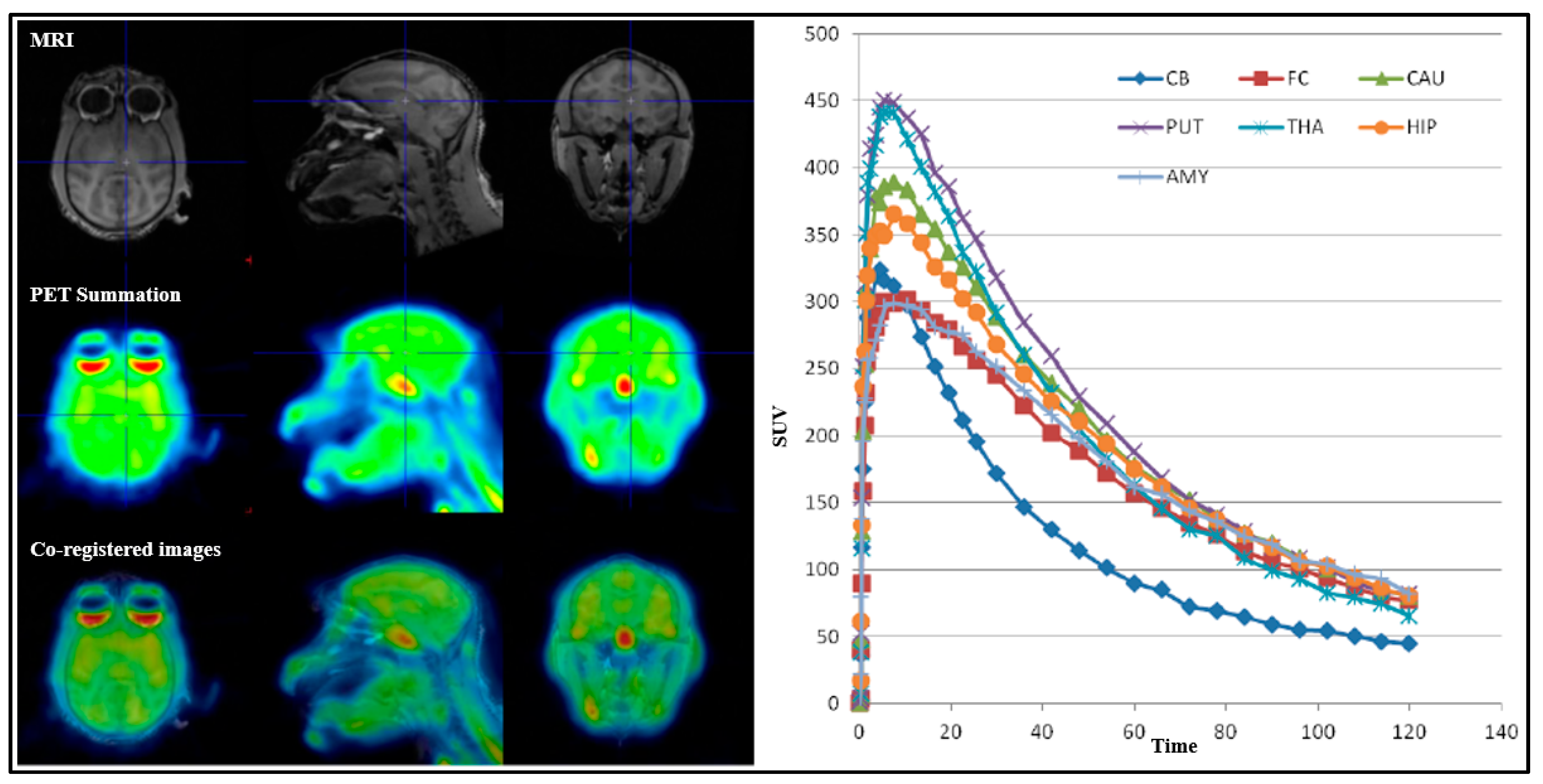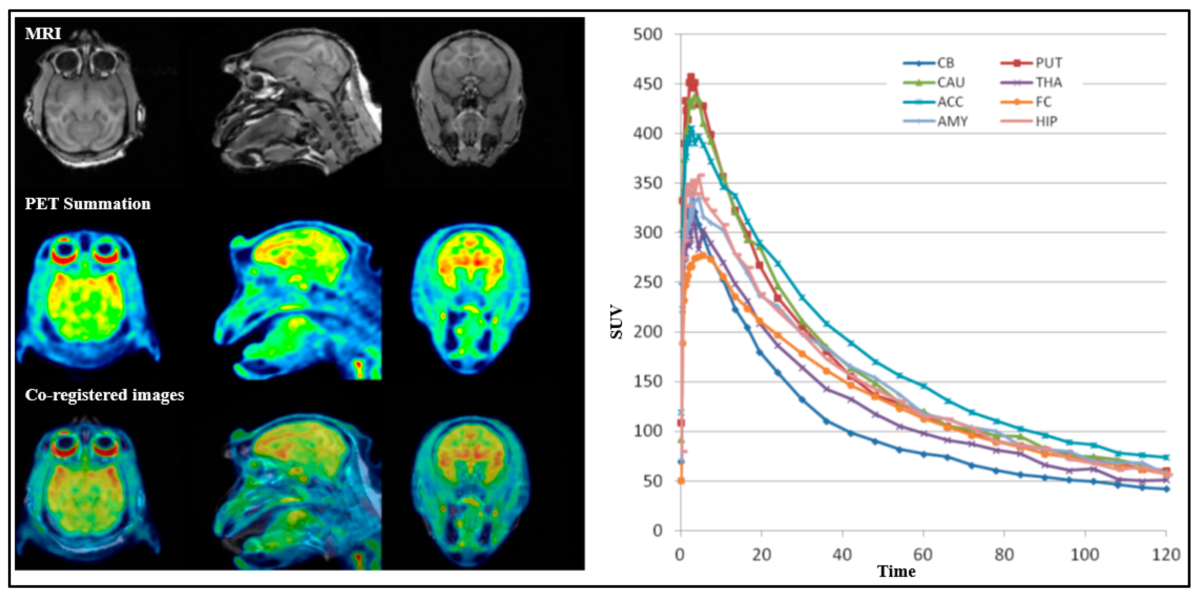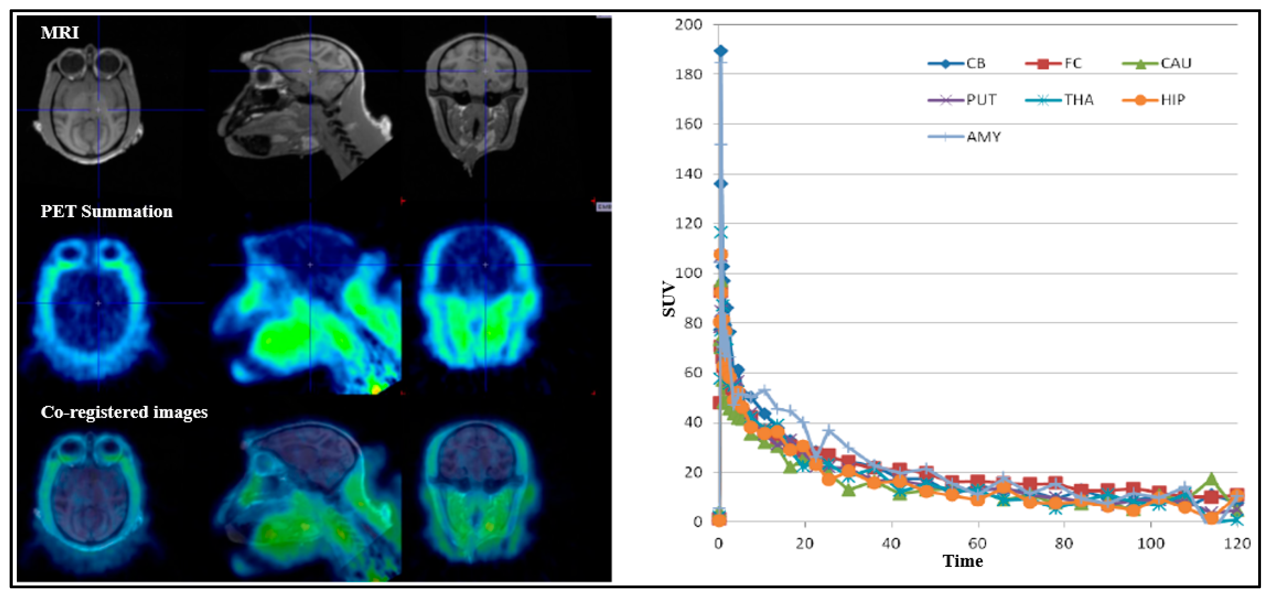 For all PET measurements, radioligands were administered via intravenous injection. Regions of interest (ROIs) were manually delineated on MRI images for each NHP, for the whole brain, cerebellum, caudate, putamen, thalamus, frontal cortex, temporal cortex, amygdala, posterior cingulate cortex, anterior cingulate cortex, hippocampus, occipital cortex, parietal cortex, ventral striatum, and insula. The summed PET images over the entire duration were co-registered with the individual NHP’s MRI image. After applying the co-registration parameters to the dynamic PET data, time–activity curves were generated for each brain region for every PET measurement. The standardized uptake value (SUV) was calculated for each brain region. The total distribution volume (