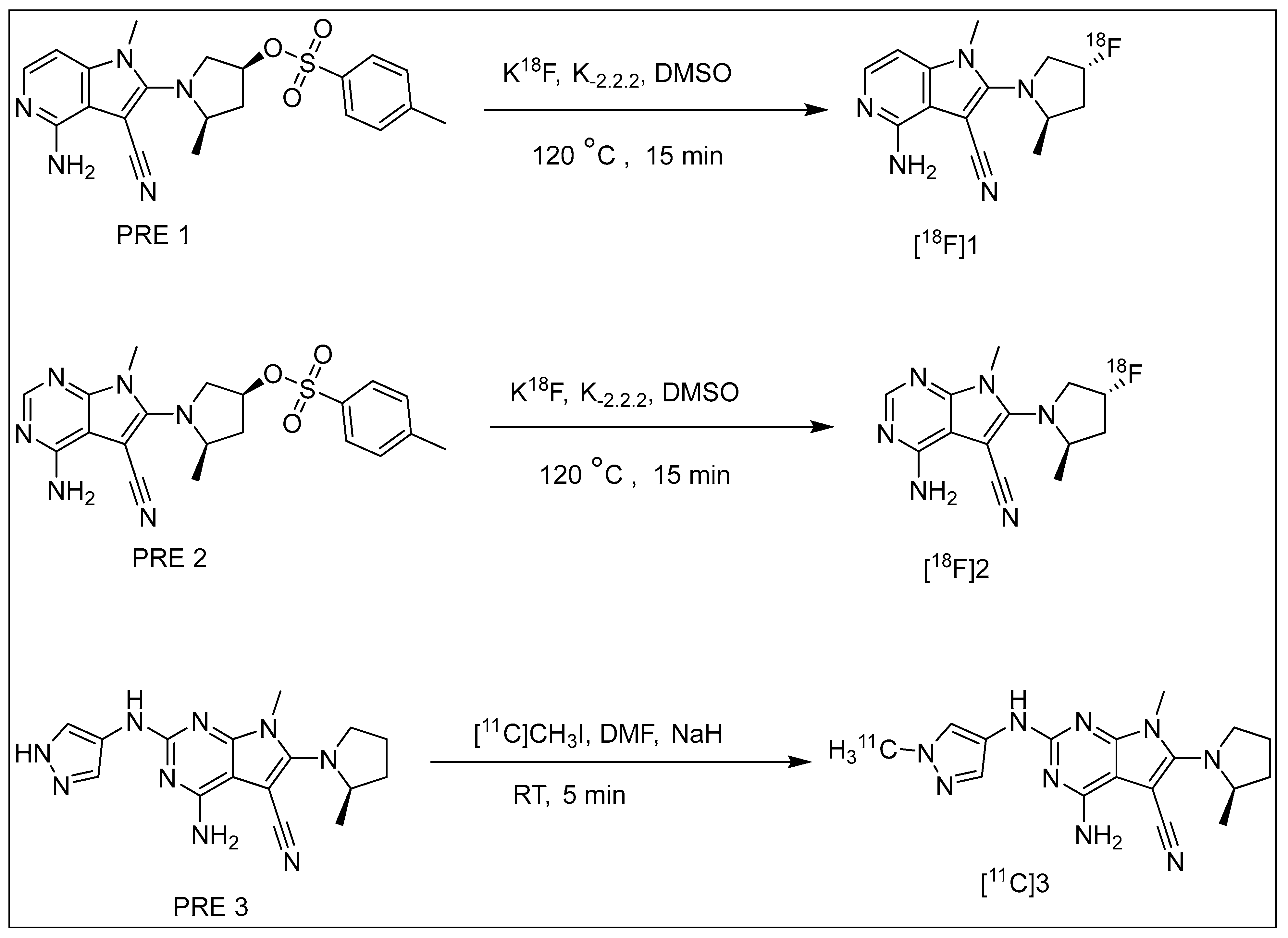 All non-radioactive reference standards, Compound 1 (4-Amino-2-((2R,4R)-4-fluoro-2-methyl pyrrolidin-1-yl)-1-methyl-1H-pyrrolo[3,2-c]pyridine-3-carbonitrile); Compound 2 (4-Amino-6-((2R,4R)-4-fluoro-2-methylpyrrolidin-1-yl)-7-methyl-7H-pyrrolo[2,3-d]pyrimidine-5-carbo nitrile); and Compound 3 ((R)-4-amino-7-methyl-2-((1-methyl-1H-pyrazol-4-yl)amino)-6-(2-methylpyrrolidin-1-yl)-7H-pyrrolo[2,3-d]pyrimidine-5-carbonitrile), as well as the corresponding precursors, Precursor 1 ((3S,5R)-1-(4-amino-3-cyano-1-methyl-1H-pyrrolo[3,2-c]pyridin-2-yl)-5-methylpyrrolidin-3-yl 4-methylbenzenesulfonate); Precursor 2 ((3S,5R)-1-(4-amino-5-cyano-7-methyl-7H-pyrrolo[2,3-d]pyrimidin-6-yl)-5-methylpyrrolidin-3-yl 4-methyl benzenesulfonate); and Precursor 3 ((R)-2-((1H-pyrazol-4-yl)amino)-4-amino-7-methyl-6-(2-methylpyrrolidin-1-yl)-7H-pyrrolo[2,3-d]pyrimidine-5-carbonitrile), were supplied by H. Lundbeck A/S. Ottiliavej 9, 2500, Valby, Denmark. All other chemicals and reagents were sourced from commercial suppliers and utilized without further purification. Solid-phase extraction (SPE) cartridges, specifically SepPak QMA Light and SepPak C18 Plus, were purchased from Waters in Milford, MA, USA. The C18 Plus cartridges were activated by rinsing with 10 mL of ethanol followed by 10 mL of sterile water. The SepPak QMA Light cartridges were activated using a 0.5M K2CO3 solution (10 mL), followed by rinsing with 15 mL of 18 MΩ water.