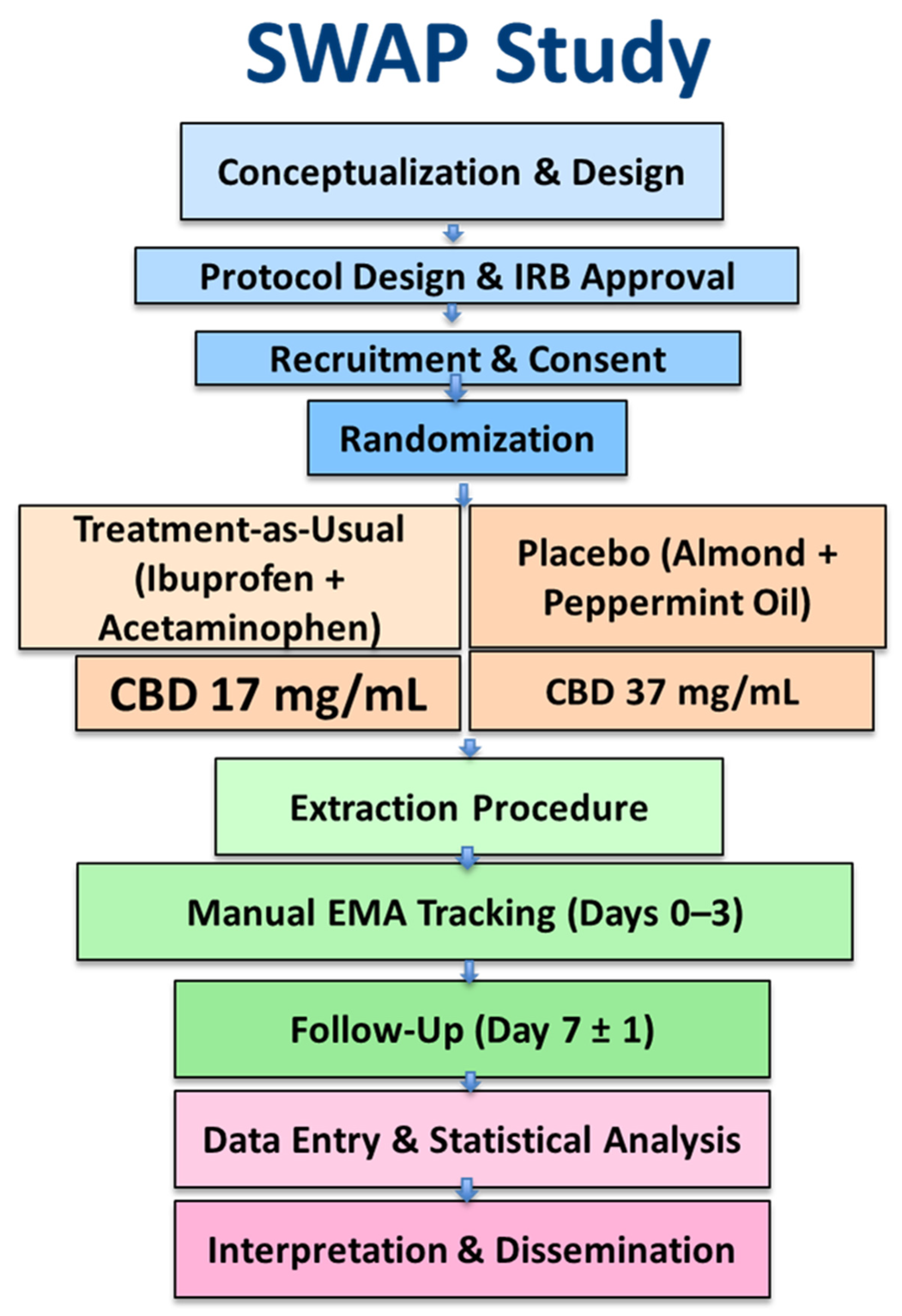 To address this, we designed the Simple Tooth Extraction with Analgesic Phytocannabinoid (SWAP) Study. SWAP evaluated the analgesic signal and safety of two oral CBD concentrations (17 mg/mL and 37 mg/mL) versus placebo and standard ibuprofen/acetaminophen in adults undergoing simple extractions. We prespecified that active treatments would show lower pain scores over the first 72 h than placebo, and explored whether CBD, particularly the higher concentration, could achieve analgesia comparable to standard therapy, with possible added benefit on inflammation suggested by prior laboratory data.