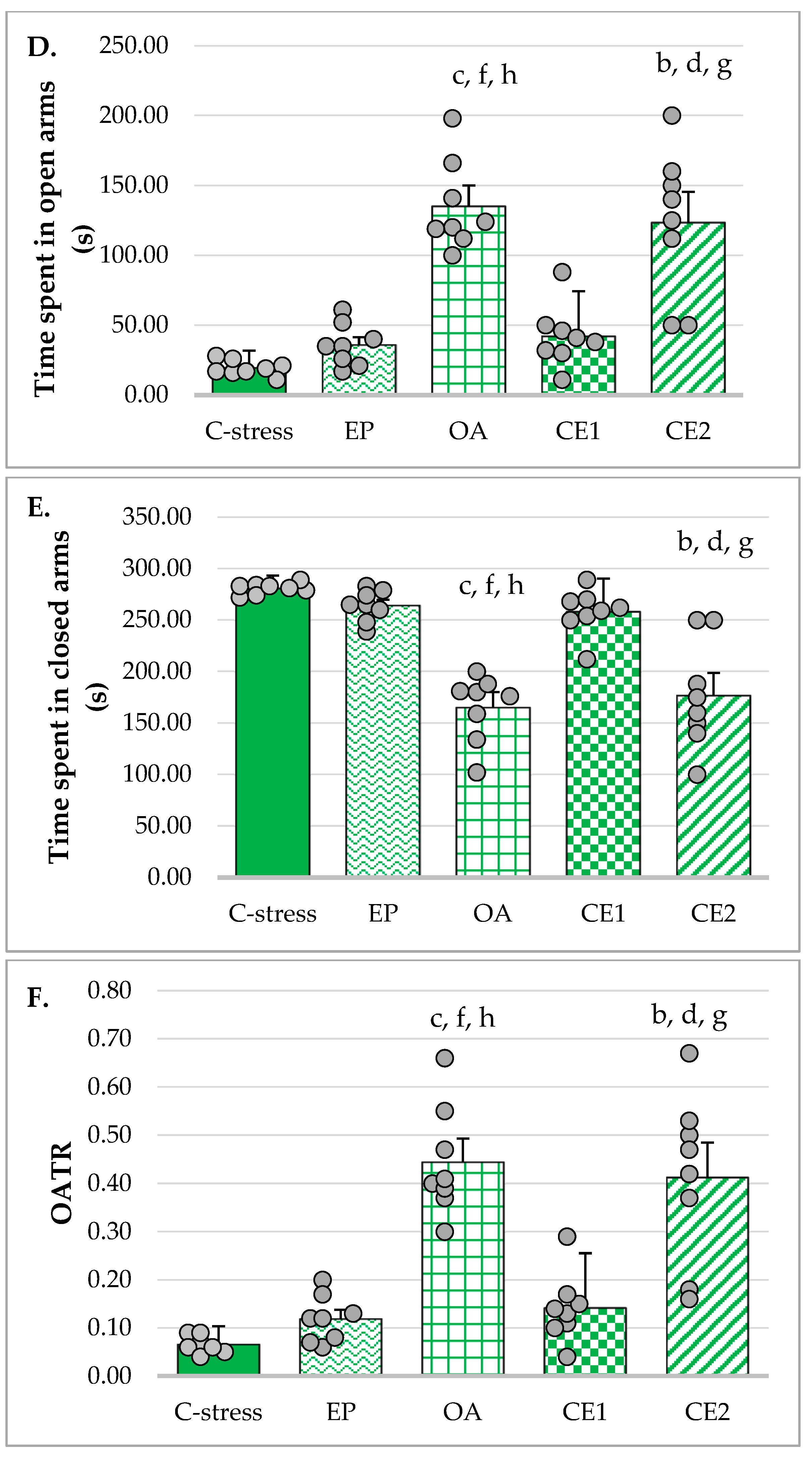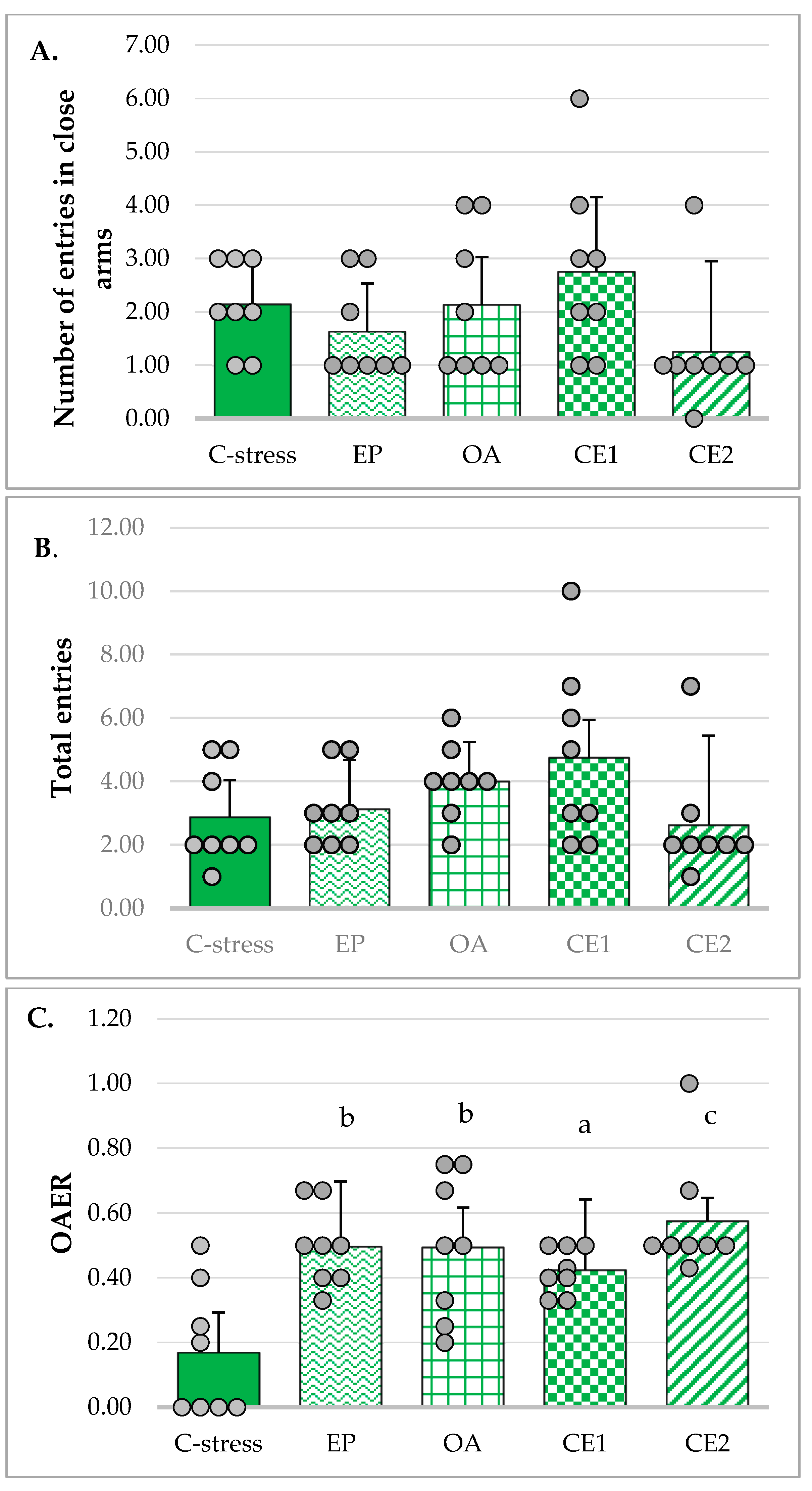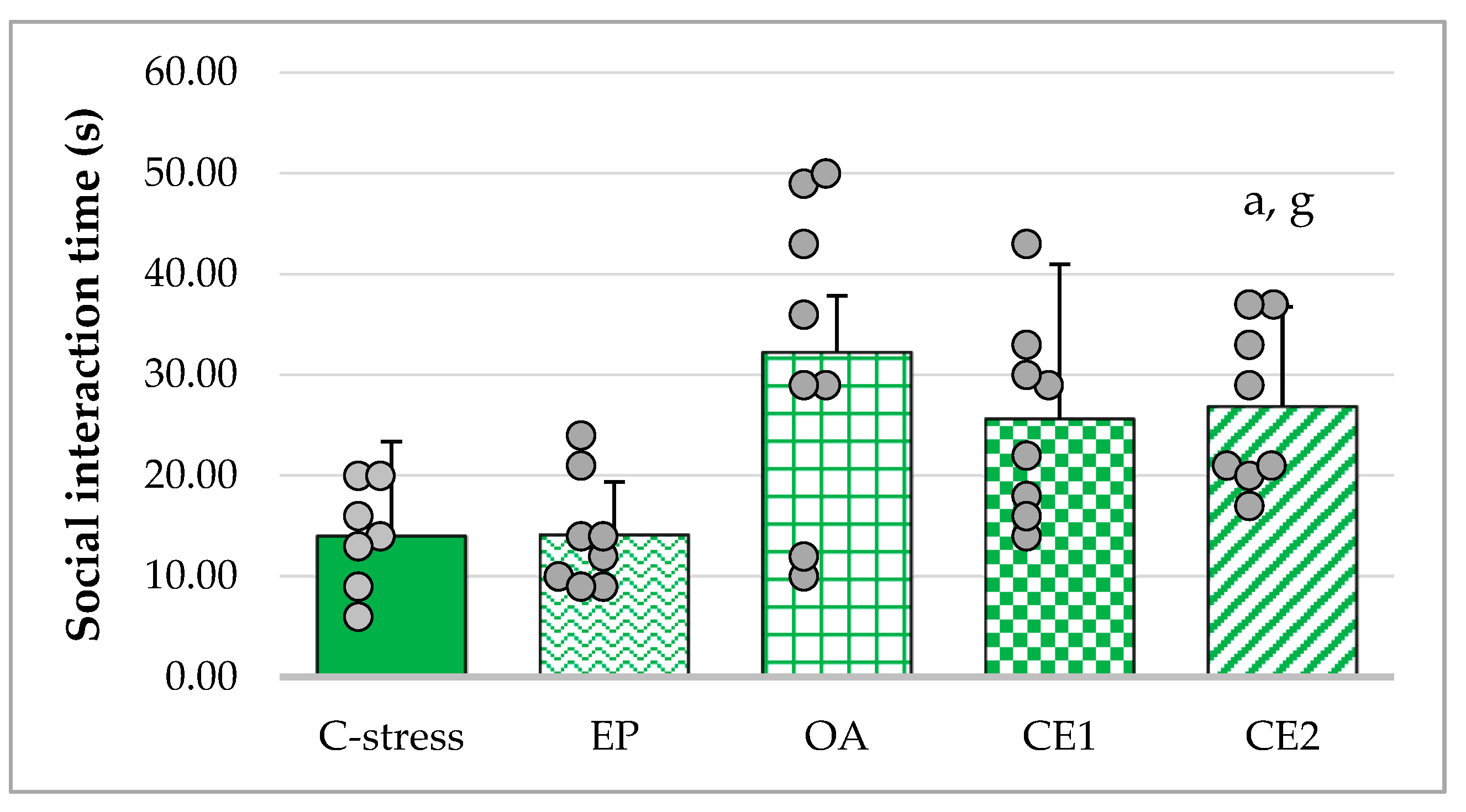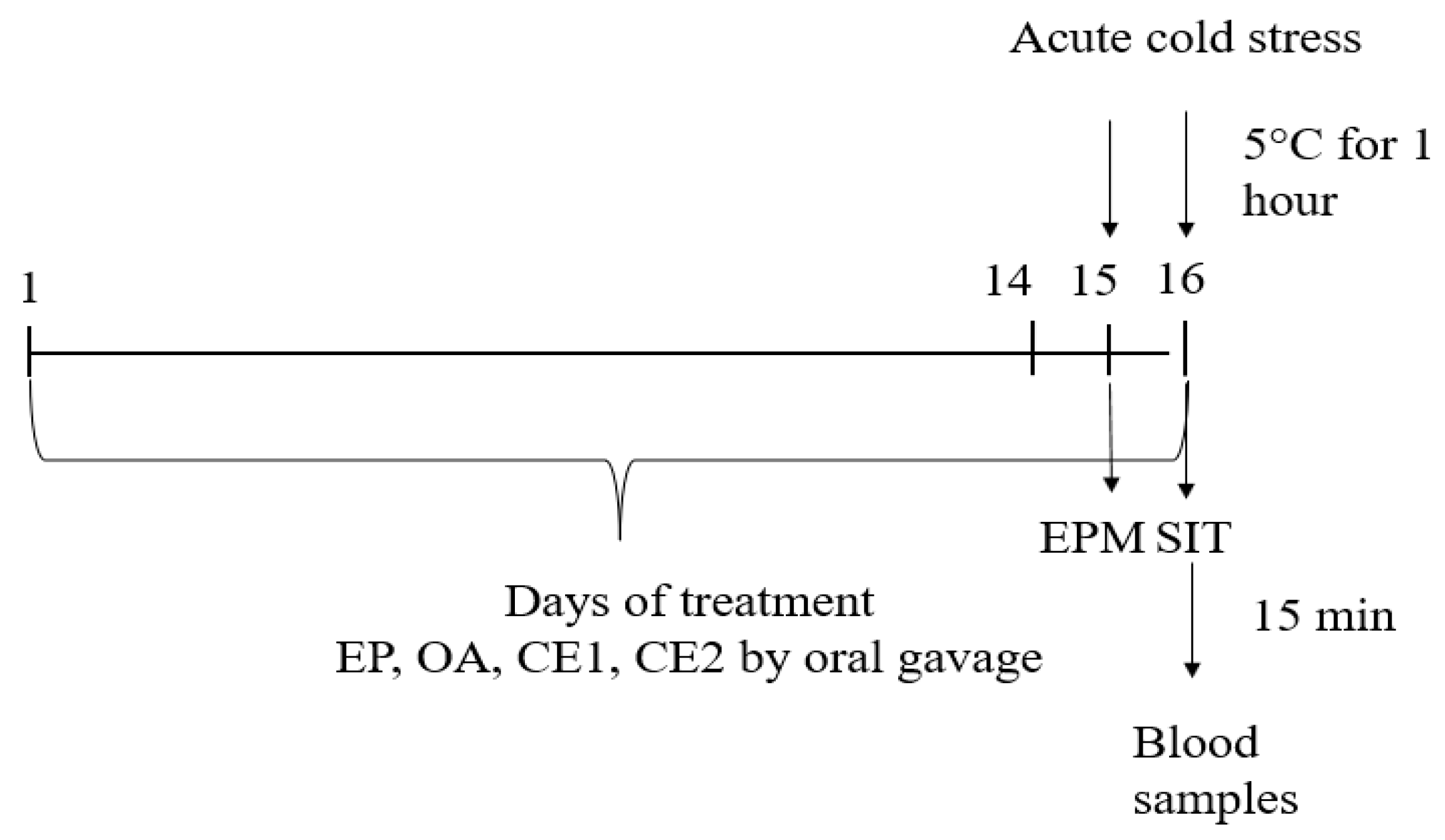2.2. Study of the Anxiolytic Effect of EP and OA Extracts and Their Combinations in Experimental Animals Subjected to an Acute Cold Stress Model