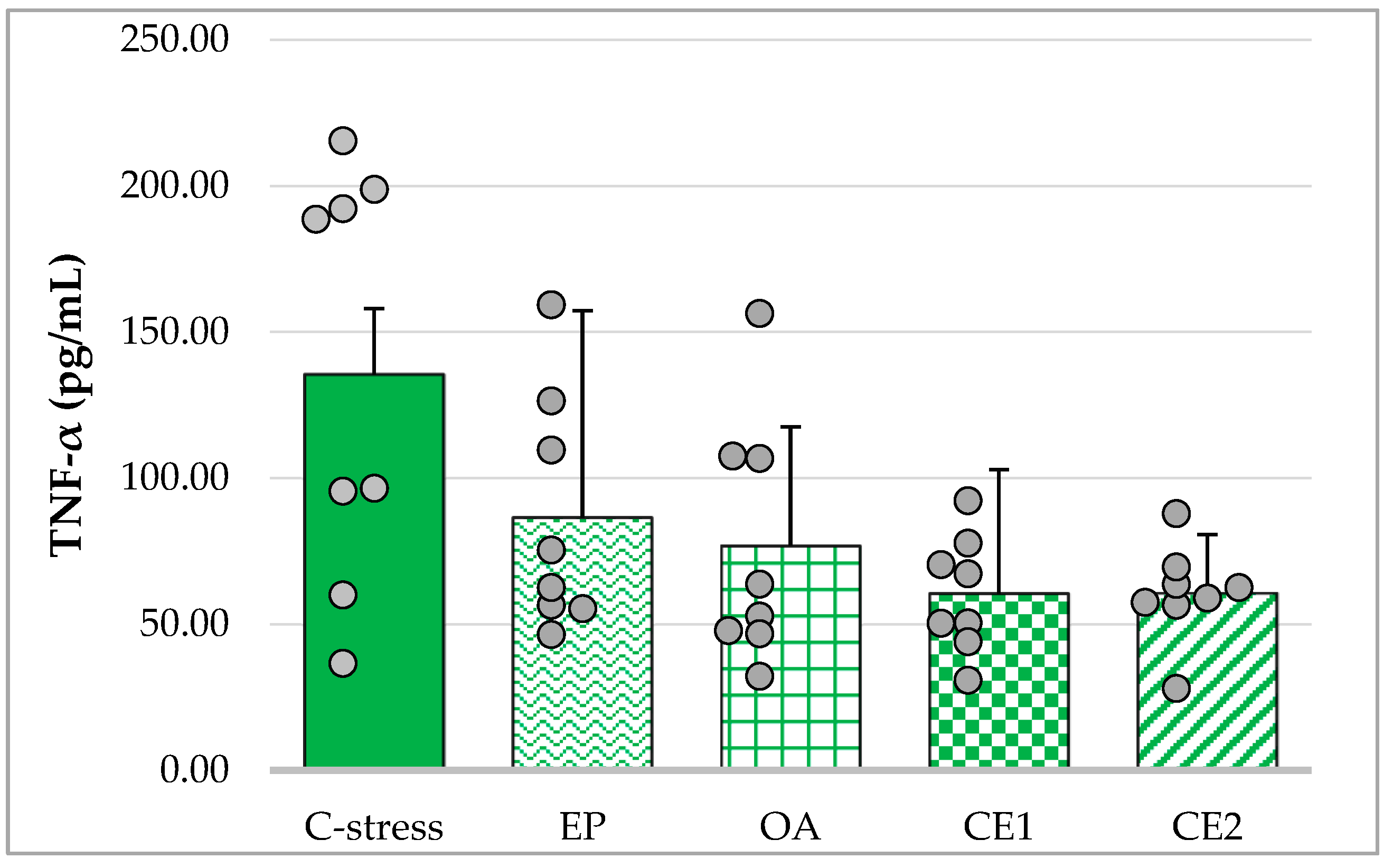 2.3. Effects of EP and OA Extracts and Their Combinations on Serum Cytokine Levels