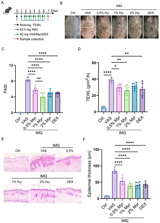 After the second IMQ induction, IMQ-treated mice were randomly divided into five groups (IMQ + vehicle, IMQ + Myr 0.5%, IMQ + Myr 1%, IMQ + Myr 2%, and IMQ + DEX; n = 6 per group). A separate healthy control group received only vehicle without IMQ treatment (n = 6).