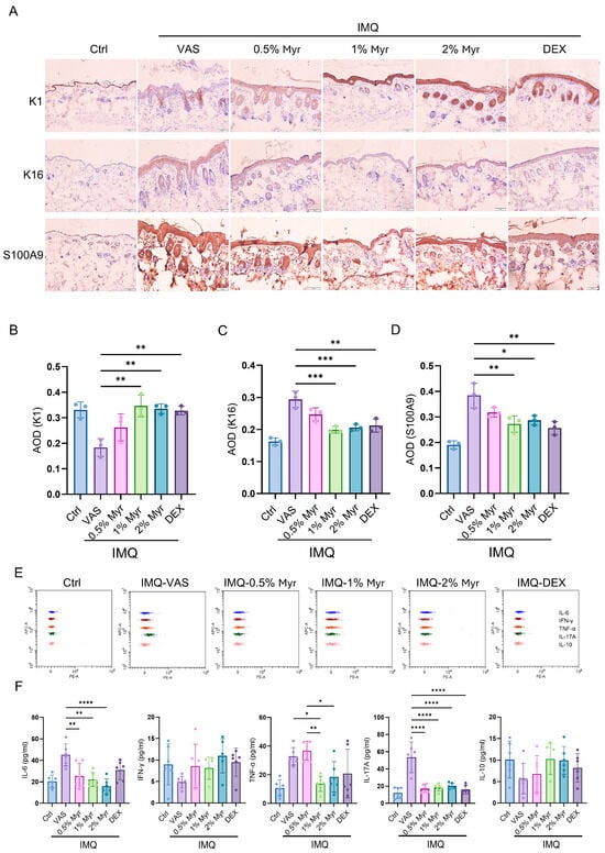 Psoriasis is characterized by excessive proliferation and abnormal differentiation of keratinocytes, leading to skin thickening and scaling []. This process is closely associated with abnormal immune activation, particularly involving T cells and cytokines, which further exacerbate local inflammation. We first performed immunohistochemistry to examine markers of keratinocyte differentiation (K1), proliferation (K16), and antimicrobial peptide secretion (S100A9). The results showed that K1 expression was significantly reduced after IMQ induction, whereas treatment with 1% and 2% Myr markedly restored K1 levels, suggesting that Myr can improve abnormal keratinocyte differentiation (Figure 3A,B). In addition, Myr treatment at 1% and 2% concentrations significantly decreased the IMQ-induced expression of K16, indicating its ability to suppress keratinocyte hyperproliferation (Figure 3A,C). At similar concentrations, Myr also notably reduced the secretion of S100A9 (Figure 3A,D). Cytokine secretion in the skin was evaluated using CBA, which showed that IMQ induction markedly increased IL-6, TNF-α, and IL-17A levels. Treatment with 1% and 2% Myr, as well as dexamethasone (DEX), significantly reduced the IMQ-induced elevation of IL-6 and IL-17A. Notably, 1% Myr also suppressed TNF-α release, with an effect even superior to that of DEX (Figure 3E,F). Collectively, these findings suggest that Myr holds promising potential in restoring inflammatory balance in psoriatic skin.