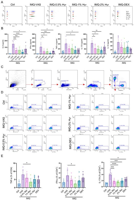 Psoriasis is a chronic inflammatory disease characterized not only by skin lesions but also by systemic immune dysregulation. Aberrant T cell-mediated responses and cytokine release (e.g., IL-17, IFN-γ, TNF-α) drive keratinocyte hyperproliferation and differentiation abnormalities while also affecting cardiovascular and metabolic systems, underscoring psoriasis as a systemic immune-mediated disorder []. We assessed inflammatory cytokine release in the serum of IMQ-induced mice using CBA. The results showed that IL-6, IFN-γ, TNF-α, and IL-17A were significantly elevated after IMQ induction (Figure 4A,B). Treatment with Myr markedly reduced these cytokines, particularly at concentrations of 1% and 2% (Figure 4A,B). Splenic profiling showed that IMQ induction markedly increased the frequencies of CD4+ T cells producing TNF-α, IFN-γ, and IL-17A. Treatment with Myr at all tested concentrations, as well as with DEX, significantly reduced the proportion of IL-17A+ CD4+ T cells. Notably, only 1% Myr treatment also led to a significant reduction in TNF-α+ and IFN-γ+ CD4+ T cells, underscoring its superior immunomodulatory activity (Figure 4C–E). These results highlight the potential of Myr to restore immune balance and attenuate systemic inflammatory responses in psoriasis.