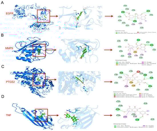 Further molecular docking was performed between Myr, and the top four proteins identified in Figure 1E (TNF, MMP9, PTGS2, and EGFR). Protein–ligand docking analysis using AutoDock Vina generated complex models of Myr with each of these proteins, with predicted binding free energies all lower than −4 kcal/mol, indicating stable interactions between Myr and TNF, MMP9, PTGS2, as well as EGFR (Figure 5A–D) []. Structural analysis further revealed that, although the interface areas between Myr and the proteins were relatively small—likely due to the compact nature of their overall structures—multiple interaction sites were present within the limited contact surfaces. Surface representation models demonstrated that Myr and the target proteins achieved close surface complementarity and formed stable complexes through several hydrogen bonds, which contributed substantially to complex stability (Figure 5A–D). These findings suggest that Myr forms stable complexes with TNF, MMP9, PTGS2, and EGFR through multiple surface-mediated hydrogen bonds, exhibiting strong binding affinity and structural stability—characteristics typical of high-affinity molecular interactions.