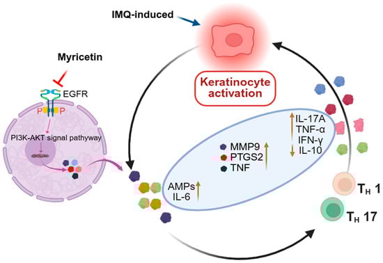 In addition to its well-known anti-inflammatory properties, this study revealed that Myr exerts therapeutic effects on psoriasis by modulating the activity of EGFR, a pivotal receptor tyrosine kinase regulating epidermal homeostasis [,]. EGFR signaling has long been implicated in keratinocyte proliferation and the amplification of psoriatic inflammation [], yet therapeutic strategies have largely centered on cytokine blockade (e.g., TNF-α or IL-17 inhibitors) rather than targeting receptor pathways directly []. Previous work has shown overexpression and activation of EGFR in psoriatic lesions and its cross-talk with IL-17A–driven responses [], while PI3K/AKT/mTOR signaling has been recognized as a central regulator of epidermal growth and metabolism []. Our findings indicate that Myr-mediated inhibition of the EGFR/PI3K/AKT signaling pathway is mechanistically linked to immune regulation rather than simple immune suppression, as it attenuates EGFR/AKT-driven keratinocyte hyperactivation and reduces epidermal-derived inflammatory signaling. This modulation contributes to normalization of dysregulated immune responses and restore immune balance in the skin microenvironment. Notably, this mechanism complements earlier reports on flavonoids such as quercetin and kaempferol, which mainly act through NF-κB or MAPK inhibition [,,]. Consistently, the regulatory effect of Myr on EGFR has also been observed in herpes simplex virus (HSV) infection, and this modulation is closely associated with the PI3K/AKT signaling pathway []. The potential of Myr to modulate EGFR activity therefore represents a mechanistic distinction and could broaden the therapeutic landscape beyond cytokine-centered interventions. From a human health perspective, its multi-target, low-toxicity pharmacological profile highlights Myr’s potential as a safe and effective candidate for managing immune-mediated cutaneous disorders. Future investigations involving human keratinocyte–immune co-culture models, together with clinical pharmacokinetic and safety evaluations, will be essential to confirm its translational applicability and therapeutic benefits in humans.