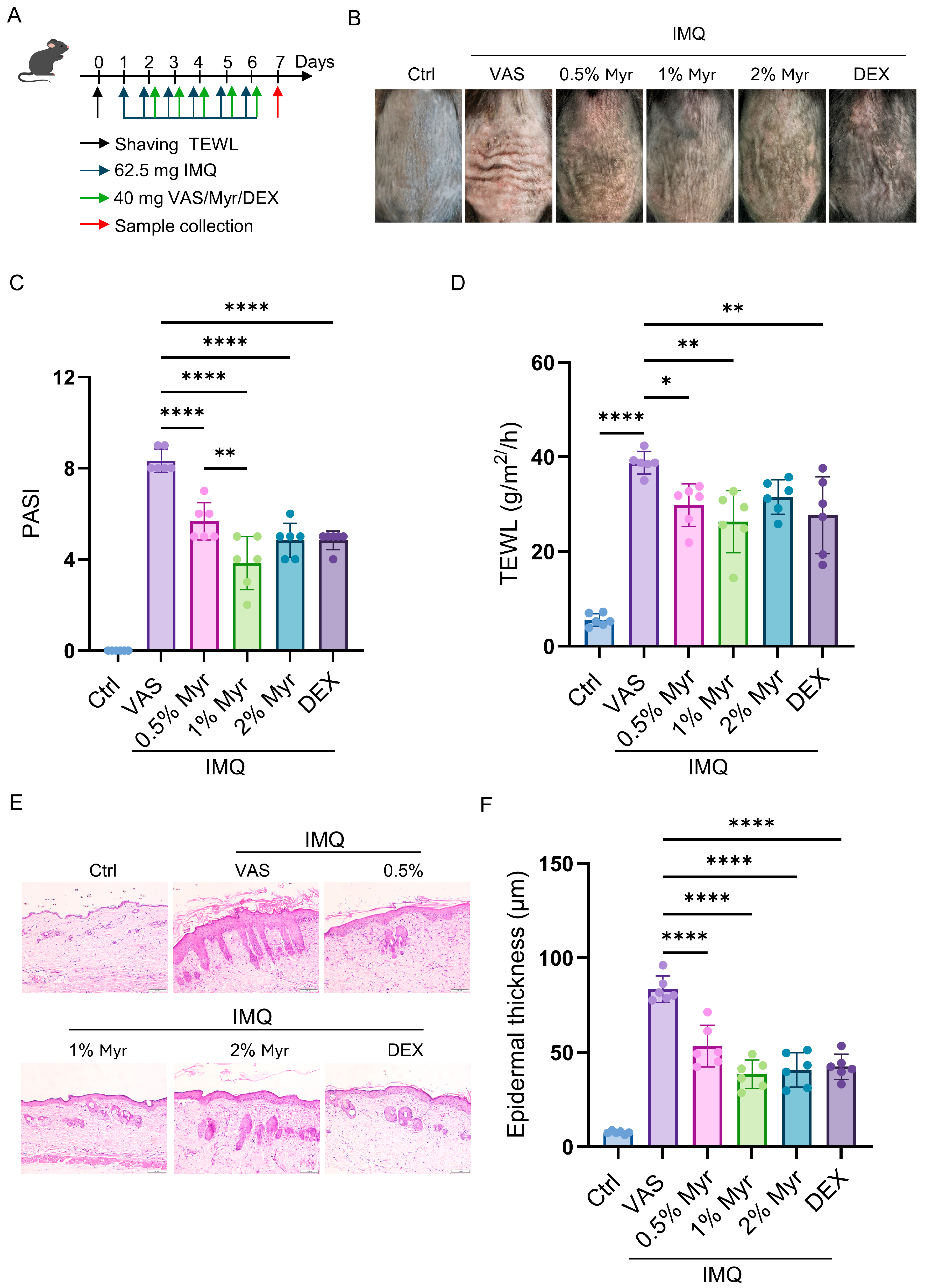 2.2. Myr Alleviates IMQ-Induced Psoriatic Skin Phenotype