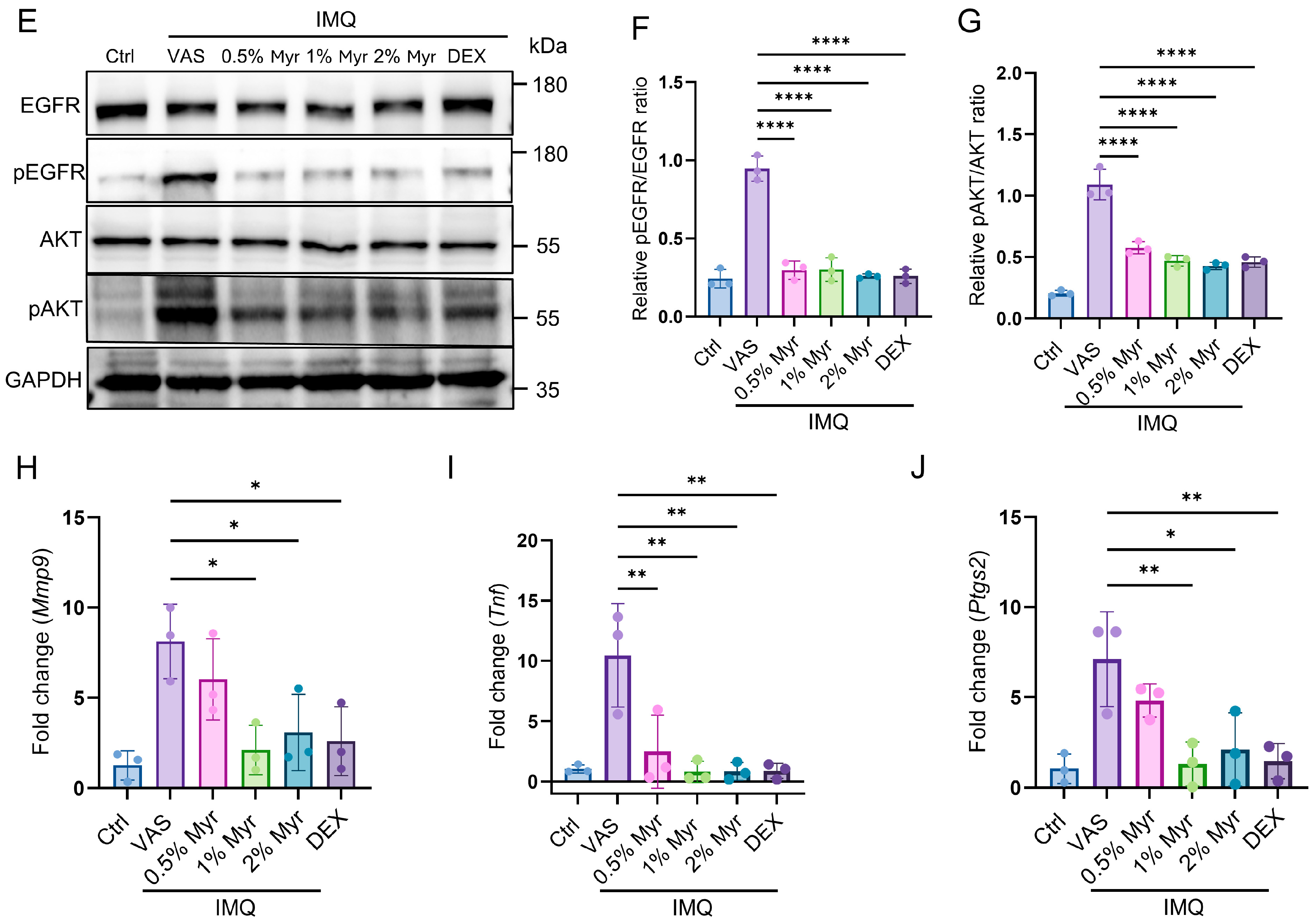 2.5. Myr Attenuates Imiquimod-Induced Skin Inflammation in Psoriasis-like Mice Accompanied by Inhibiting the EGFR/AKT Signaling Pathway and Decreasing the Levels of Mmp9, Ptgs2 and Tnf