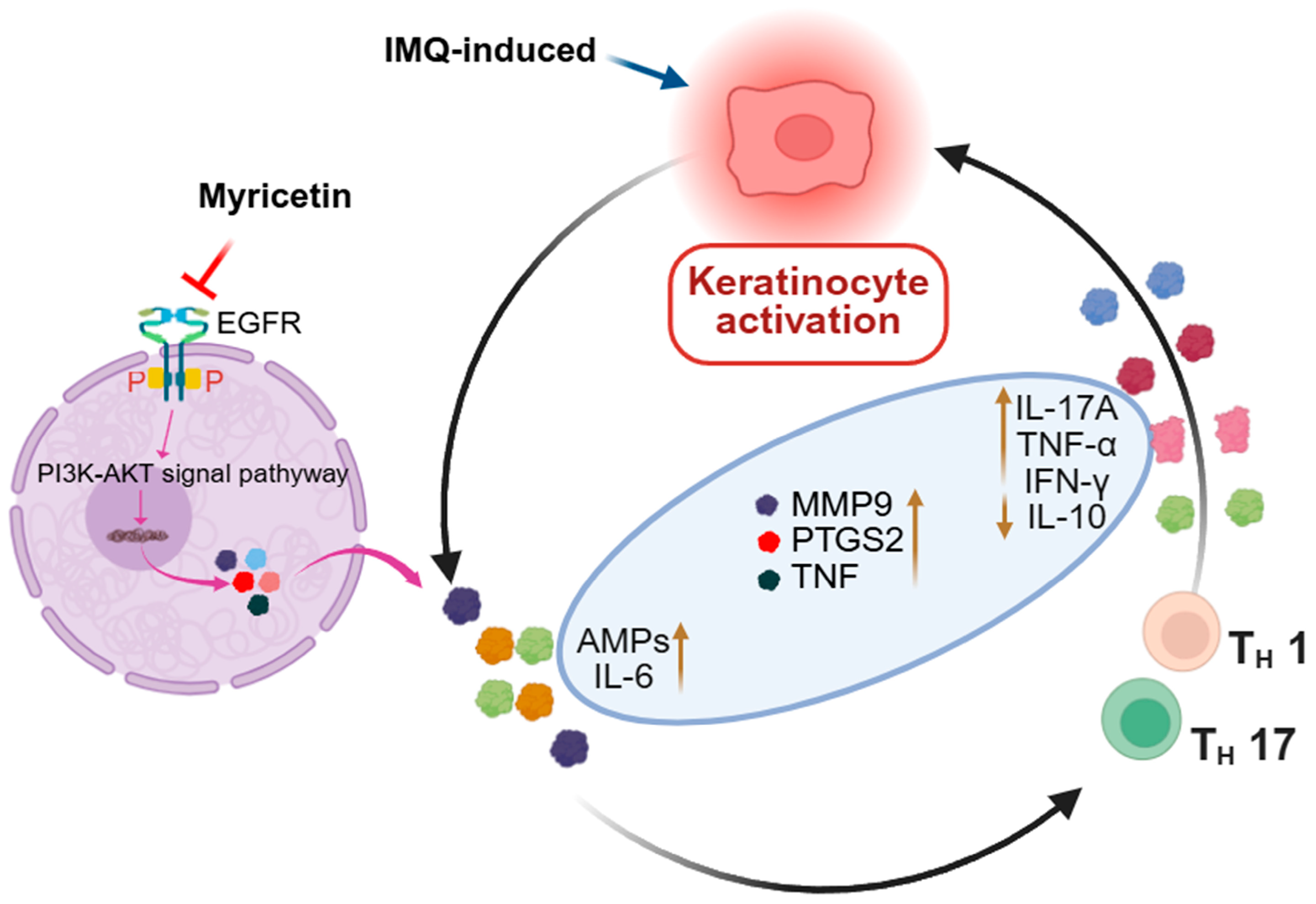 Qin, D.; Gao, R.; Wu, L.; Dong, L.; Qin, L.; Song, J. Myricetin Attenuates IMQ-Induced Psoriatic Inflammation Through Multi-Target Modulation: Evidence from Network Pharmacology and Experimental Validation. Pharmaceuticals 2025, 18, 1802. https://doi.org/10.3390/ph18121802