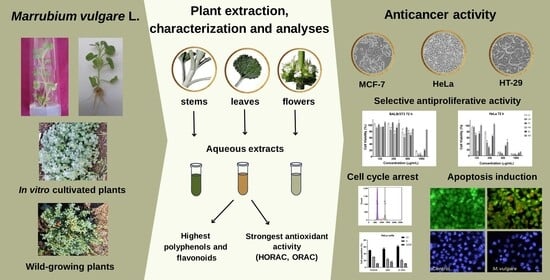 Antioxidant and Anticancer Activities of Water Extracts from Flowers, Leaves and Stems of In Vitro Cultivated and Wild-Growing Marrubium vulgare Plants