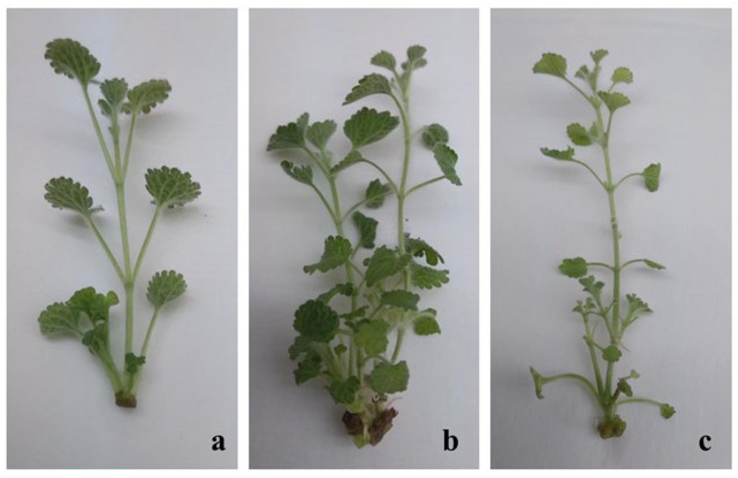 - Abdallah, S.A.S.; Hassan, H.M.S.; El-Mekawy, M.A.; Ali, N.A.M. Application of tissue culture technique on Marrubium vulgare L. plant. Hortscience J. Suez Canal Uni 2018, 7, 1–10. [Google Scholar]