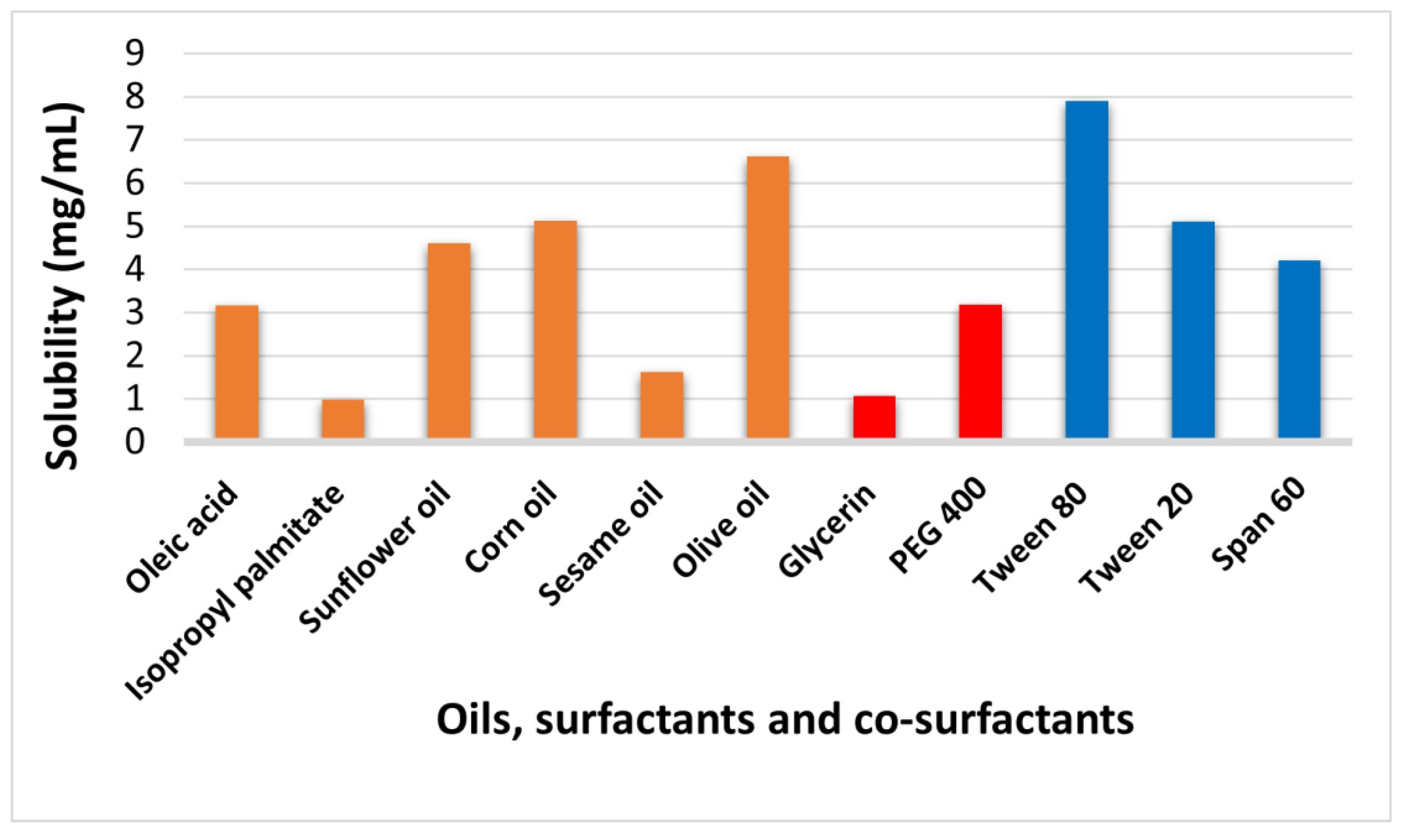 2.2. Saturation Solubility of P. pterocarpum Extract Using Different Oils, Surfactants, and Co-Surfactants