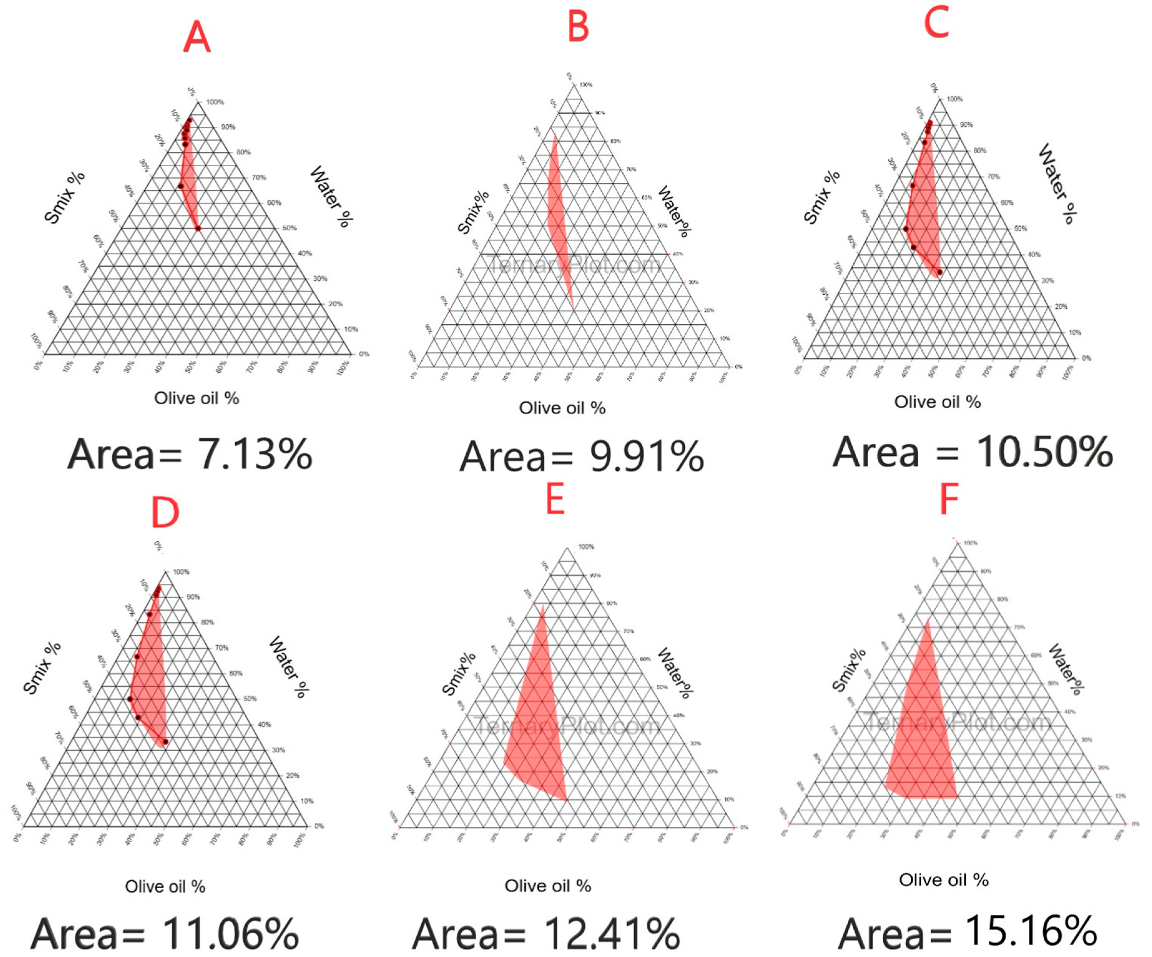 | Formula | Oil:Smix Ratio | Olive Oil (g) | Smix (g) | De-Ionized Water (g) |