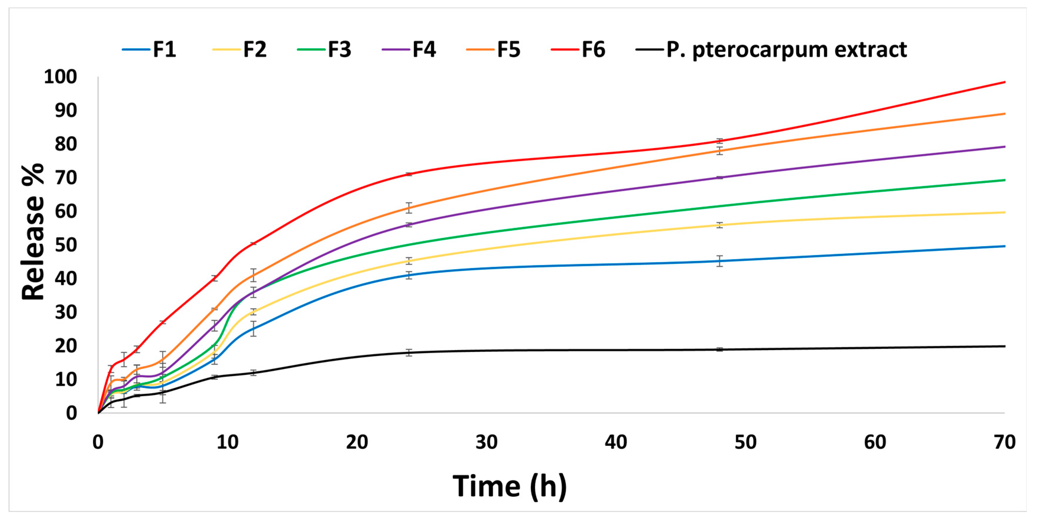 3.5. Solubility of P. pterocarpum Extract in Different Oils, Surfactants, and Co-Surfactants