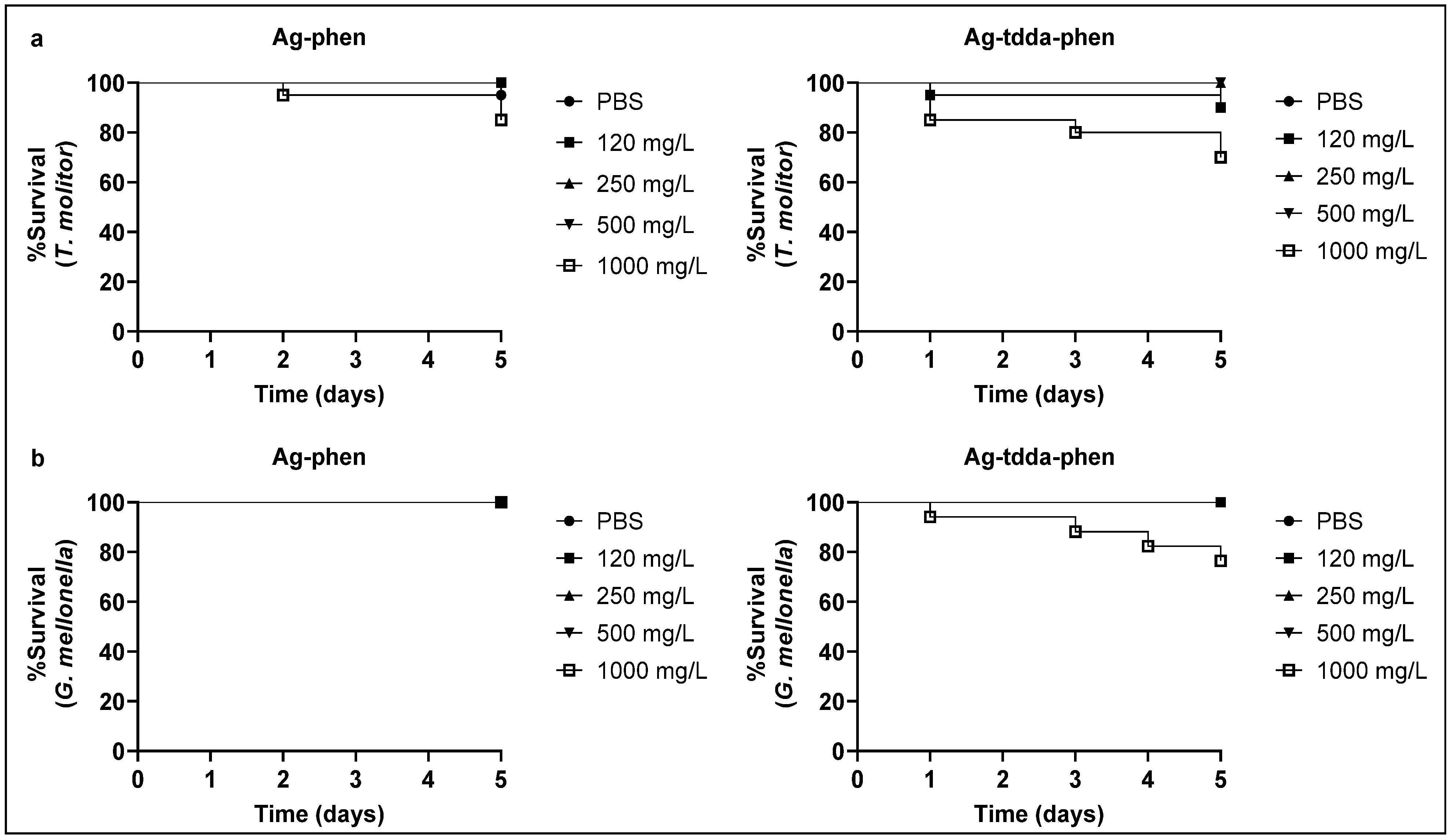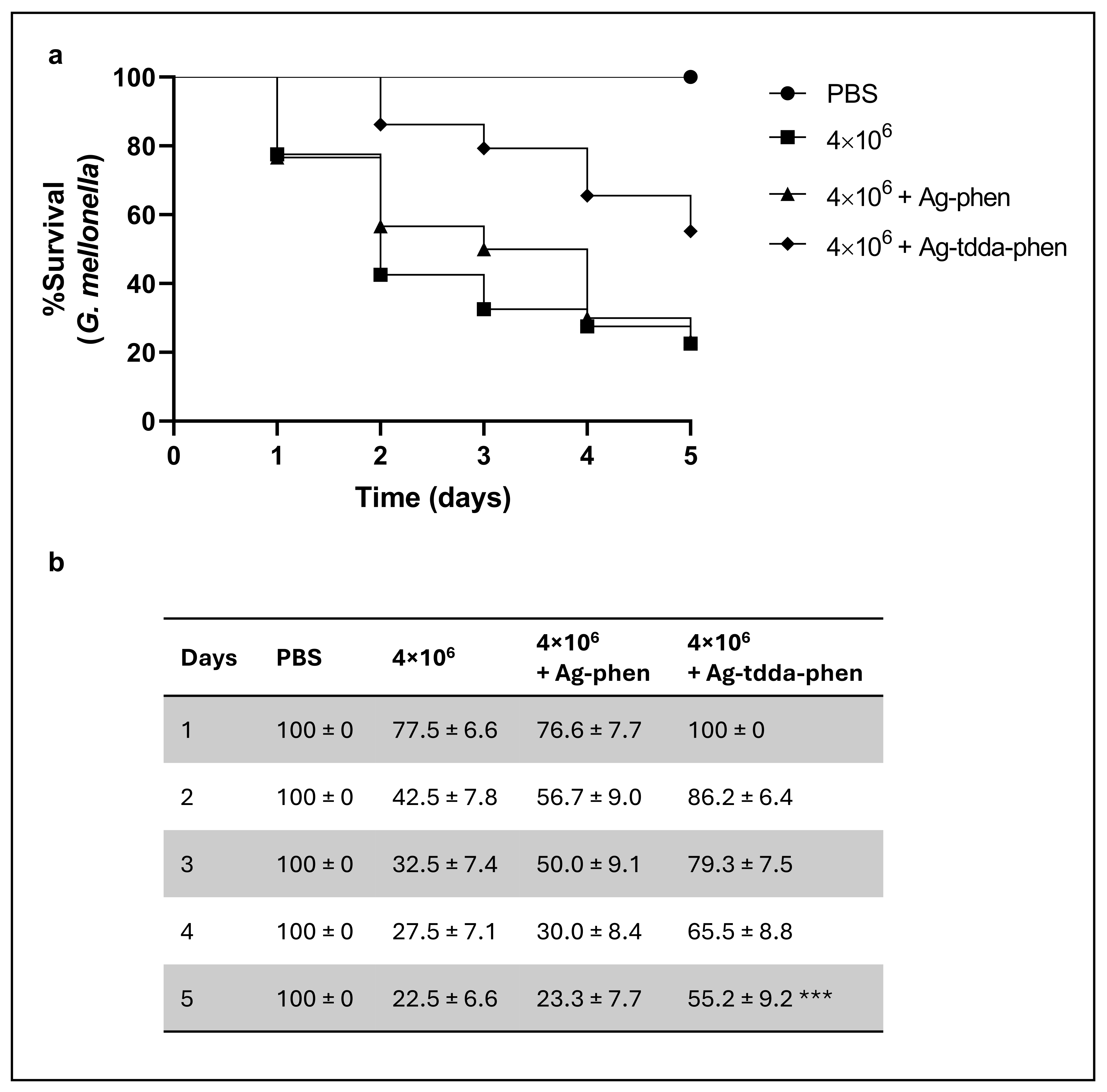 - Gandra, R.M.; McCarron, P.; Viganor, L.; Fernandes, M.F.; Kavanagh, K.; McCann, M.; Branquinha, M.H.; Santos, A.L.S.; Howe, O.; Devereux, M. In vivo activity of copper(II), manganese(II), and silver(I) 1,10-phenanthroline chelates against Candida haemulonii using the Galleria mellonella model. Front. Microbiol. 2020, 11, 470. [Google Scholar] [CrossRef]