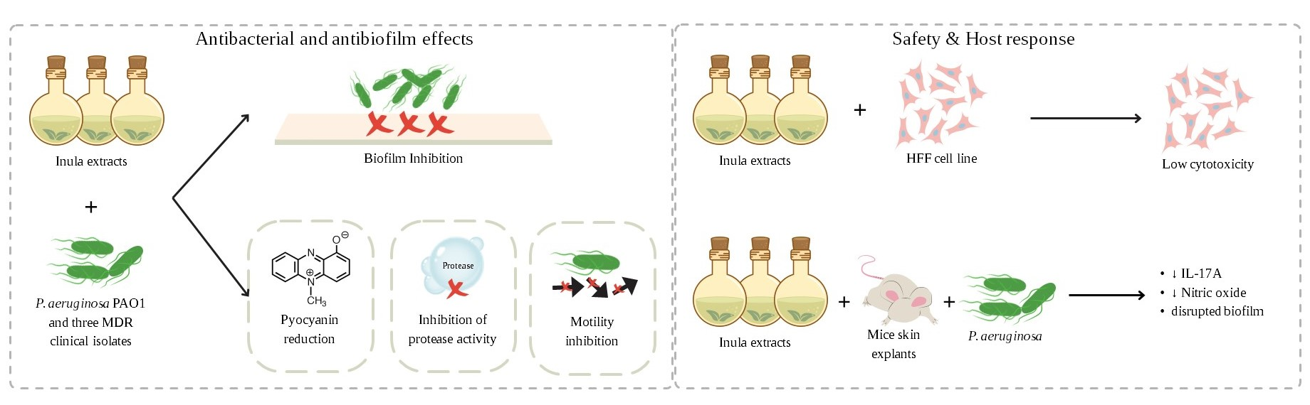 Paunova-Krasteva, T.; Dimitrova, P.D.; Damyanova, T.; Borisova, D.; Leseva, M.; Uzunova, I.; Dimitrova, P.A.; Ivanova, V.; Trendafilova, A.; Veleva, R.; et al. Interference of Pseudomonas aeruginosa Virulence Factors by Different Extracts from Inula Species. Pharmaceuticals 2025, 18, 1824. https://doi.org/10.3390/ph18121824