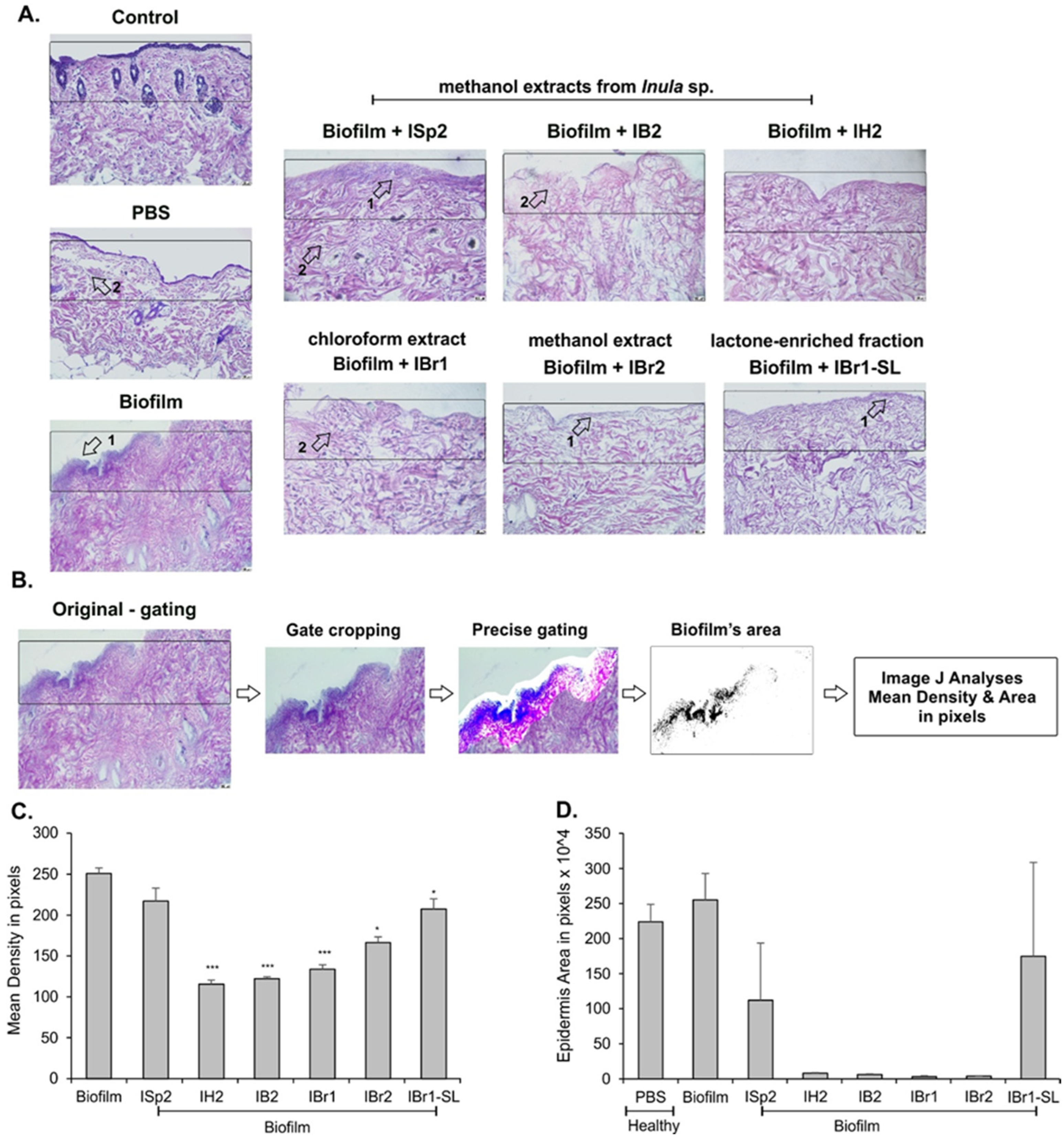2.9. Effect of the Extracts on P. aeruginosa Biofilm Formation at Murine Skin Explants