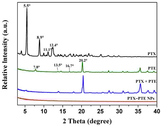 The formation of multi-drug co-crystals often leads to alterations in the physicochemical properties of drugs []. PXRD is widely recognized as an effective technique for assessing changes in drug crystallinity []. The PXRD patterns of PTX, PTE, PTX + PTE and PTX-PTE NPs are presented in Figure 1. PTX exhibits distinct diffraction peaks at 2θ angles of 5.5°, 8.9°, 11.1°, and 12.4°, consistent with previous studies []. Similarly, PTE displays characteristic diffraction peaks at 2θ of 7.8°, 13.5°, 16.7°, and 20.2° [], PTX + PTE is manifested as the physical superimposition state of PTX + PTE, whereas the PTX-PTE NPs shows only a broad diffraction halo without discrete peaks, suggesting the formation of an amorphous state between PTX and PTE [].