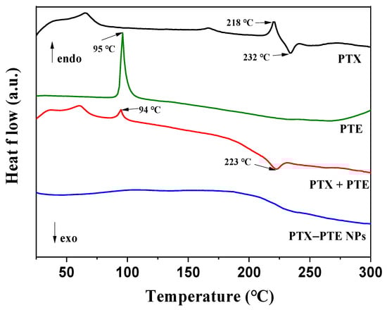 To confirm the amorphous nature of the PTX-PTE NPs, thermal analysis was employed to investigate its phase transition behavior. As shown in the DSC thermogram (Figure 2), PTX exhibits an endothermic peak at 218 °C followed by an exothermic peak at 232 °C [], which aligns with its known melting point. PTE also demonstrates a sharp endothermic peak at 95.7 °C, consistent with literature reports []. PTX + PTE simultaneously possesses the thermal variations of both PTX and PTE. In contrast, the PTX-PTE group displays characteristics distinct from those of crystalline compounds. Its DSC curve reveals a single glass transition temperature typical of amorphous materials, with the disappearance of the original melting peaks of both PTX and PTE []. These findings, together with the PXRD results, support the presence of a co-amorphous system formed between PTX and PTE.