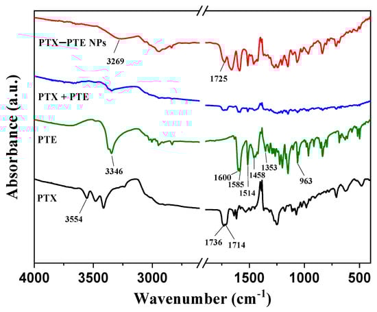 Infrared spectroscopy (Figure 3) further elucidates the molecular interactions within the system. FTIR analysis of PTE revealed characteristic absorption bands at 1600.15, 1585.55, 1514.71, 1458.43, 1353.35, and 963.31 cm−1, corresponding to the stretching vibrations of aromatic -C=C-, alkenes -C-C-, aromatic -C=C-, aromatic -C=C-, -C-O- and trans-alkenes -C=C-, respectively, similar to those reported in reference []. PTX, on the other hand, showed characteristic absorption bands at 1736 and 1714 cm−1, corresponding to the stretching vibration of C=O, similar to those reported in reference []. The absorption bands at 3346 cm−1 in PTE and 3554 cm−1 in PTX are attributed to the stretching vibration of O-H. The FTIR spectrum of PTX + PTE indicates a physical mixture of PTX and PTE, suggesting no interaction between them. However, the FTIR spectrum of the PTX - PTE group shows a broad peak at 3269 cm−1, indicating a shift in the phenolic hydroxyl group of PTE from 3346 cm−1 to 3269 cm−1. Additionally, the vibration peak corresponding to the carbonyl group shifts to 1725 cm−1, suggesting that the development of the co-amorphous system might be due to the interaction between the carbonyl group of PTX and the phenolic hydroxyl group of PTE []. Based on the single-factor investigation of PTX-PTE NPs, especially the influence of temperature on the formation of PTX-PTE NPs, the co-precipitation of PTX and PTE is the key to the formation of PTX-PTE NPs. According to reference [], PTX and PTE need to reach a thermodynamic equilibrium state during the co-precipitation process in order to form self-assembly. This is a different point from a simple physical mixture.