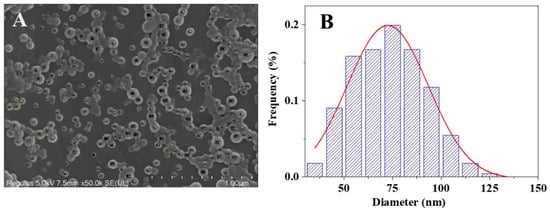 SEM image of PTX-PTE NPs at 50,000 times magnification (A) and in its particle size distribution graph, the red line represents the curve obtained through Gaussian fitting (B).