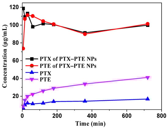 As illustrated in Figure 6, the dissolution profiles of PTX-PTE NPs and the raw drugs were evaluated in a 0.3% SDS aqueous solution. Upon formation of the nanocomplexes, PTX-PTE NPs rapidly attained peak mass concentration in the dissolution medium, followed by a gradual decline, exhibiting a characteristic “spring-parachute” effect. This phenomenon can be primarily attributed to the higher free energy of amorphous drugs, whose original long-range ordered crystalline structures are disrupted. As a result, they can dissolve rapidly without the need to overcome lattice energy during the dissolution process []. However, upon exposure to the dissolution medium, the surface of the amorphous drug may undergo recrystallization, which could hinder further dissolution of the inner layers []. Due to its hydrophobic property, PTX maintains a relatively low solubility, with a maximum concentration of only 16.03 μg/mL in an aqueous solution containing 0.3% SDS. Analysis of the dissolution data reveals an overall dynamic trend indicating that PTX-PTE NPs demonstrate significantly enhanced dissolution performance compared to the raw PTX. Specifically, in the 0.3% SDS aqueous solution, the peak concentration of PTX in PTX-PTE NPs was approximately 7 times higher than that of the raw PTX drug, further confirming the beneficial effects of amorphization and nanoscale size on the drug dissolution behavior. This “synergistic effect” is manifested as a higher dissolution rate in the dissolution experiment and is further verified in the in vitro cell model for its biological performance advantages.