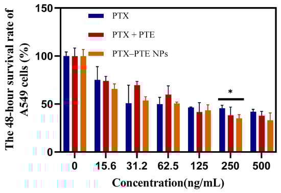 The effects of PTX + PTE, PTX-PTE NPs and PTX on A549 cells. The data represented as the mean ± SD (n = 3). * p < 0.05.