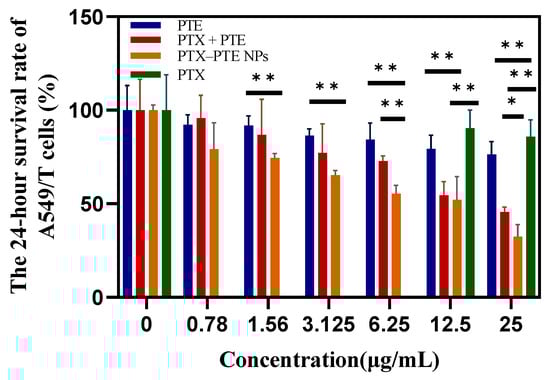 The effects of PTX + PTE, PTX-PTE NPs, PTX and PTE on A549/T cells after 24 h of administration. The data represented as the mean ± SD (n = 3). * p < 0.05, ** p < 0.01.