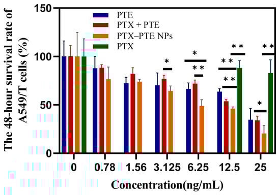 The effects of PTX + PTE, PTX-PTE NPs, PTX and PTE on A549/T cells after 48 h of administration. The data represented as the mean ± SD (n = 3). * p < 0.05, ** p < 0.01.