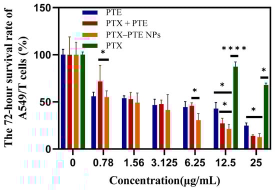 The effects of PTX + PTE, PTX-PTE NPs, PTX and PTE on A549/T cells after 72 h of administration. The data represented as the mean ± SD (n = 3). * p < 0.05, **** p < 0.0001.