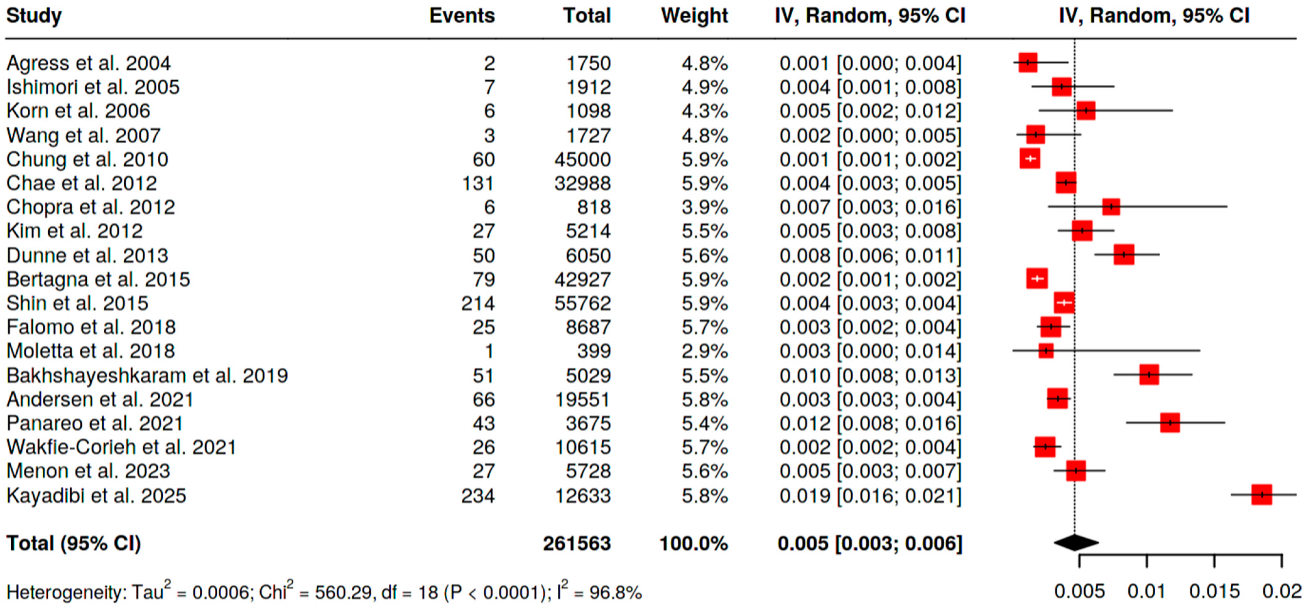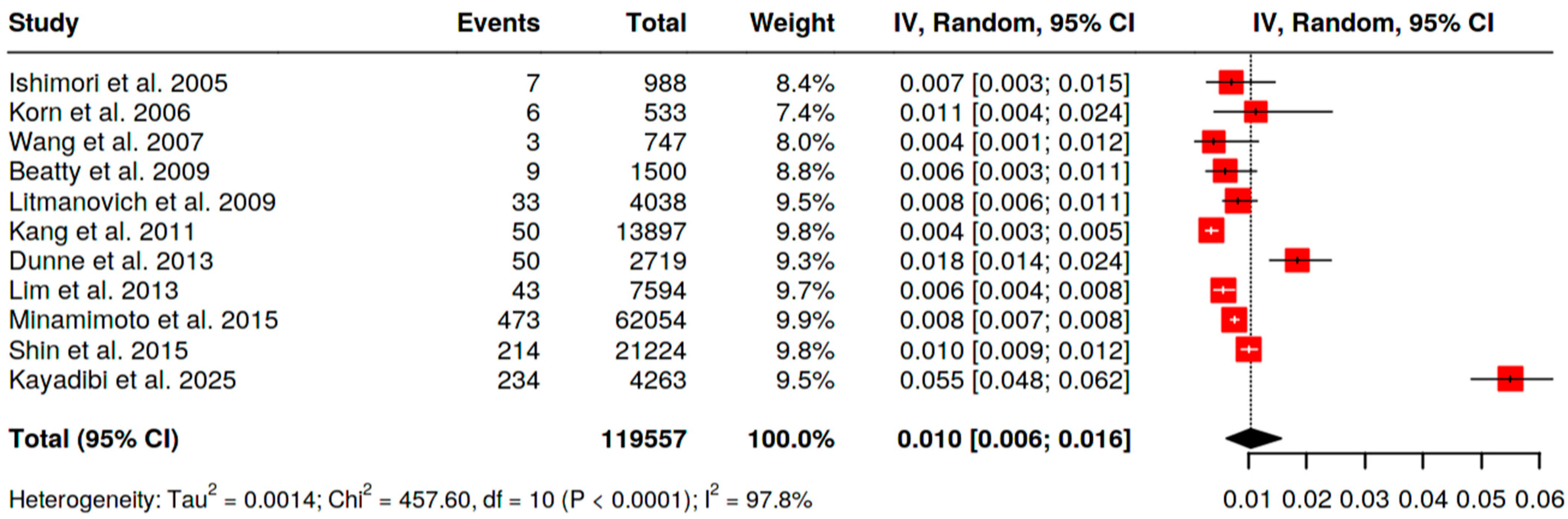 | Ishimori et al. [11] | 2005 | USA/R | 1912 | 7 | 0.4% | 988 | 7 | 0.7% | 2 | 2 | 100% | 28.6% | |