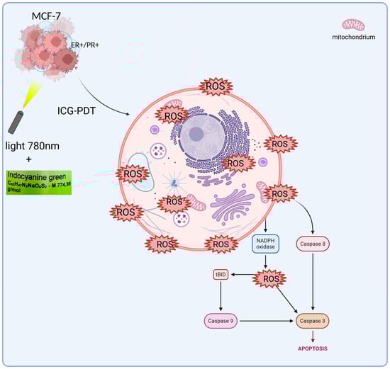 Breast cancer remains one of the most diagnosed malignant cancers in the world, posing a serious challenge to modern oncology []. According to the World Health Organization (WHO), more than 2.3 million new cases of breast cancer were reported in 2022, highlighting the need for new, effective therapeutic strategies []. The MCF-7 cell line, isolated in 1970 from the pleural effusion of a 69-year-old patient with metastatic breast cancer, is one of the most important in vitro models used in breast cancer research []. It expresses estrogen receptors (ER), progesterone receptors (PRs), and moderate levels of HER2, making it representative of luminal subtype A of breast cancer []. The MCF-7 cell line is widely used to study the mechanisms of proliferation, apoptosis, and response to various forms of therapy, including chemotherapy, radiotherapy, and novel approaches such as photodynamic therapy (PDT) [,]. Indocyanine green (ICG) is an FDA-approved fluorescent dye that is currently used in diagnostic imaging and PDT []. PDT consists of three basic components: a photosensitizer (PS), singlet oxygen, and light. The mechanism of PDT is based on administering a photosensitizer that accumulates in the desired cells and then influencing these cells with light of the appropriate PS wavelength under aerobic conditions []. These mechanisms lead to the formation of reactive oxygen spices (ROS) that induce target cell death. The PS can be administered locally or systemically []. There is an accumulation of PS in the desired tissue and then absorption of the light energy of the applied light. The PS transitions from the ground state (S0) to the excited singlet state (S1), and then through the intersystem transition to the long-lived triplet state (T1). In the T1 state, the PS can donate an electron or hydrogen atom, leading to the formation of free radicals (type I) such as superoxide anion radicals (O2−), hydroxyl radicals (-OH), or hydrogen peroxide (H2O2), or transfer energy directly to the oxygen molecule, thereby producing singlet oxygen (1O2) (type II) []. Singlet oxygen has a high reactivity that leads to damage to lipids, nucleic acids, or proteins at the cellular level. This leads to the activation of apoptosis, necrosis, or autophagy []. Both types I and II (Figure 1) can occur simultaneously. However, the dominance of one type is dependent on the main components of PDT []. In type I, the mechanism of the PS in the triplet state involves transferring an electron or hydrogen atom to the substrates and thus free radicals are formed. In type II, singlet oxygen is produced, the energy of which is transferred directly to molecular oxygen, thus creating singlet oxygen []. In MCF-7, PDT leads to dominant apoptosis via ROS, activating caspases and damaging mitochondria.