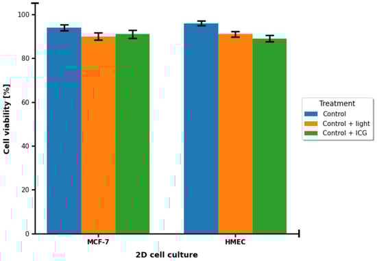 Cell survival [%] in control groups of 2D MCF-7 and HMEC cell cultures. Blue corresponds to the control group. Orange corresponds to the control group treated with 780 nm light. Green corresponds to the control group treated with 100 μM ICG.