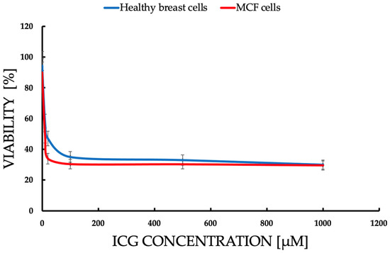 Comparison of the dependence of cell survival [% viability] on ICG concentration in the range of 1–1000 μM, after 72 h incubation after ICG-PDT. Statistically significant differences (p < 0.05) between the lines confirm a higher sensitivity of MCF-7 cells to ICGs, with viability dropping from 94.5% (0.1 μM) to 15.83% (1000 μM) vs. healthy cells (97.8% to 55.2%). The blue line represents healthy breast cells. Red line represents the MCF-7 cell line.