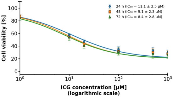 2D MCF-7 cell culture in relation to ICG concentration using the IC50 logarithmic scale. The logarithmic scale highlights differences in toxicity at lower concentrations, indicating IC50 for MCF-7. The blue line represents responses at time 24 h. The orange line represents responses at time 48 h. The green line represents responses at time 72 h.