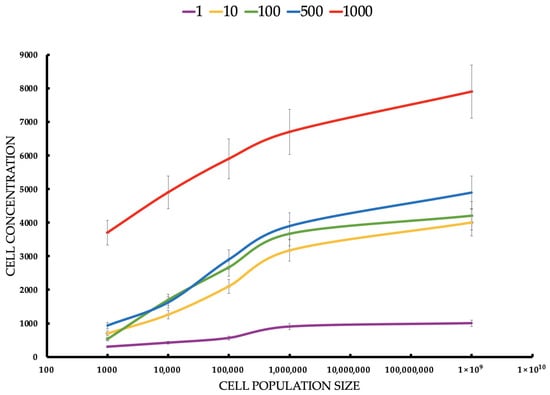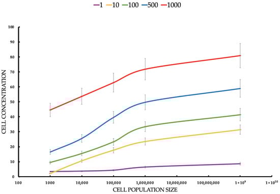 Cell concentration (cell/mL) of MCF-7 tumor cells estimated by flow cytometer after ICG-PDT at different ICG concentrations and tumor cell populations. Statistical differences between the concentrations (p < 0.05) confirm the dependence of the PDT effect on the ICG dose. The red line responds to a concentration of 1000 μM of ICG. The blue line responds to a concentration of 500 μM of ICG. The green line responds to a concentration of 100 μM of ICG. The yellow line responds to a concentration of 10 μM of ICG. The violet line responds to a concentration of 1 μM of ICG.