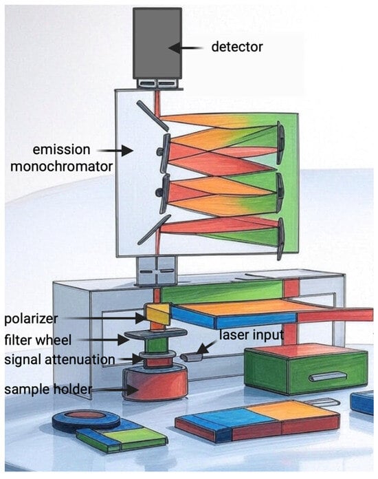 The measurement protocol was carried out in accordance with the manufacturer’s (PicoQuant) information, using the FluoTime 300 “EasyTau” (Figure 10) system, which is a fully automated spectrometer for fluorescence lifetime measurements, equipped with options for phosphorescence measurements, including singlet oxygen emission in the NIR range. We used a picosecond pulsed diode laser as the ICG excitation source. The emission was collected at an angle of 90° using a NIR-sensitive detector with a monochromator. The EasyTau 2.3. software (PicoQuant, Berlin, Germany) automated the setup, i.e., wavelength selection, slit adjustment (10 μm–4 mm), spectrum acquisition, and kinetics. The data was analyzed in FluoFit with exponential fitting and quality assessment. To optimize sensitivity and minimize noise, the PMT detector was thermoelectrically cooled to reduce dark counts. We used long-pass filters (scattered light rejection 1:105–1:1010) and overload protection. The monochromator was set to 1270 nm with a resolution of ≤0.1 nm, NIR-optimized gratings. The sample was placed in a 1 cm cuvette in a multifunctional chamber at a temperature of 15 °C. The entire setup was controlled by software—there were no manual adjustments of the optics during measurement.