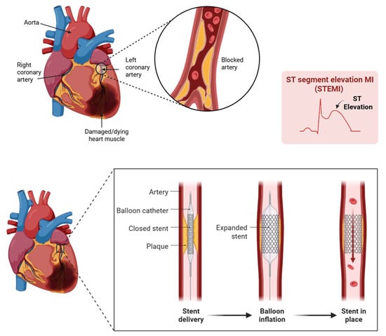 When a STEMI occurs, a major coronary artery is blocked, depriving heart tissue of oxygen. As seen here in the ST elevated myocardial infarction (STEMI)-gram, the blockage is clear. Immediate intervention through Percutaneous Coronary Intervention, or PCI, restores blood flow. Created with BioRender.com.