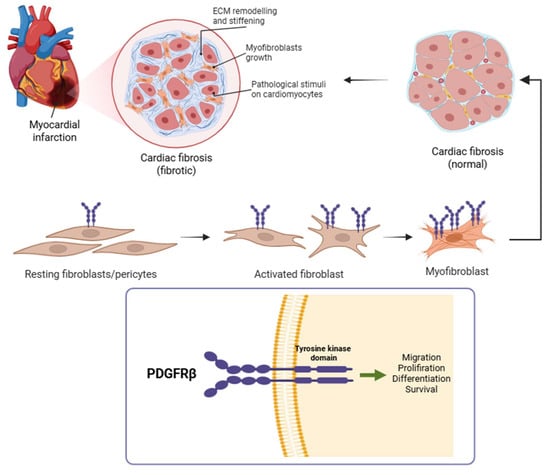 Following myocardial infarction, quiescent cardiac fibroblasts become activated and differentiate into myofibroblasts, which are central to extracellular matrix deposition and scar formation [6]. This panel illustrates that transition, culminating in the fibrotic remodeling of the infarcted myocardium. During this process, PDGFRβ is markedly upregulated on the surface of activated fibroblasts and myofibroblasts. Given its cell-type specificity during active fibrogenesis, PDGFRβ serves as a promising molecular target for non-invasive imaging of myocardial fibrosis. Created with BioRender.com.