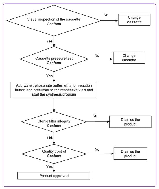 The production process was carried out in four clearly defined stages. Initially, the integrity of the disposable cassette was verified to ensure it was intact and free of leaks. The second stage involved conditioning the SPE cartridge in preparation for product purification. The third stage encompassed radiolabeling, followed by purification, formulation, and sterile filtration of the final product. The final step focused on verifying the integrity of the sterile filter using a pressure hold test. Overall, the procedure encompassed radiolabeling, purification, and sterile filtration steps. The manufacturing was a continuous process without isolation of the active substance.