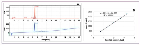 (A) Typical HPLC-chromatograms of quality control with UV absorption profile (lower panel) and radioactivity signal profile (upper panel) of [68Ga]Ga-ATH001; (B) UV-HPLC signal calibration of ATH001 (R2 = 0.9999).