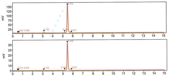 Decay-corrected radiochemical yield was 61.7 ± 4.9% with a duration of the production of 45–60 min. Stability studies demonstrated that the product remained stable at room temperature for at least 2 h, maintaining a radiochemical purity of 96.8 ± 0.7%. Addition of EtOH (7–10% (v/v)) as a radical scavenger effectively mitigated oxidative radiolysis and improved RCP (Figure 7). The signals corresponding to the radioactive impurities were reduced by 90%.