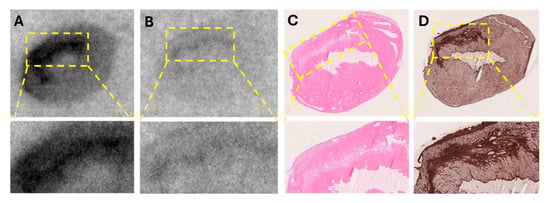 The in vitro autoradiography assay demonstrated a clear increase in [68Ga]Ga-ATH001 binding in the infarcted areas (Figure 8A). The localization of the infarct was confirmed by H&E and SR (Figure 8C,D), as well as the upregulation of PDGFRβ protein by IHC (Figure 8D. Competition with unlabeled ATH001 in excess almost completely abolished the binding, indicating receptor-specific binding (Figure 8B). Interestingly, a smaller, but detectable blockable signal was also observed in the remote and contralateral regions of the left ventricle, perhaps indicative of upregulation of PDGFRβ in response to the infarction.