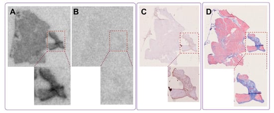 In vitro autoradiography of fibrotic tissue from a human heart, demonstrating specific uptake of the radiopharmaceutical in fibrotic regions (A). Binding was significantly reduced in the presence of excess unlabeled precursor, confirming target specificity (B). The tracer binding co-localized with fibrotic regions identified by anti-PDGFRβ IHC (C) and Masson’s trichrome staining (D), which highlights extensive collagen deposition in the same areas, indicating mature fibrosis.