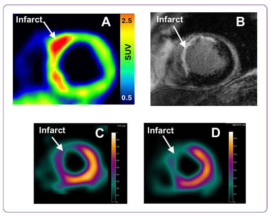 Here, we present preliminary images of [68Ga]Ga-ATH001 uptake in a patient with STEMI, and its correlation to the location of the infarct and the associated perfusion defect. The images will later be quantified when the entire study with eight patients in each cohort have been examined and will be presented separately. The scans presented qualitatively herein were performed 1 week post PCI. The injected mass of the tracer was below 100 µg per subject, and the injected radioactivity was 160 MBq. No adverse events related to the tracer were observed at these dosing levels. The patient demonstrated strong focal [68Ga]Ga-ATH001 uptake localized to the infarct regions (Figure 10A), as detectable by gadolinium late enhancement MRI, indicating extracellular volume expansion (Figure 10B). However, the tracer uptake was also increased in the peri-infarcted regions beyond the verified infarct. Uptake in the right ventricle was low (Figure 10A, seen as a faint blue signal to the left of the panel). The area with high [68Ga]Ga-ATH001 binding also overlapped well with a perfusion defect in the myocardium seen in by 15O-H2O (Figure 10C,D).