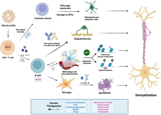 The core pathogenic mechanism of demyelinating diseases involves autoimmune response-mediated targeted injury to myelin []. Environmental factors (such as Epstein–Barr virus [EBV] infection []) activate myelin-specific T cells via molecular mimicry, leading to a breakdown of immune tolerance in genetically susceptible individuals (e.g., carriers of the HLA-DRB1 allele) [,]. Activated CD4+ T cells (particularly the Th17 subset []) cross the blood–brain barrier (BBB), releasing pro-inflammatory cytokines (IL-6 and IL-17) and recruiting B cells to produce anti-myelin antibodies (e.g., anti-MOG and anti-AQP4). These antibodies directly damage oligodendrocytes through complement-dependent cytotoxicity (CDC) and antibody-dependent cellular phagocytosis (ADCP), resulting in myelin breakdown. Concurrently, a vicious cycle arises from glial–immune cell interactions: the caspase-3-dependent cleavage of GSDME protein in microglia triggers pyroptosis, releasing pro-inflammatory cytokines such as IL-1β and IL-18, which thereby amplify neuroinflammation and inhibit the autophagic clearance of myelin debris []. Furthermore, Wnt-signal-hyperactivated oligodendrocyte precursor cells (OPCs) secrete the chemokine CCL4, recruiting CD4+ T cells and inducing macrophages to transform into cytotoxic subsets with high TNFα expression, which directly kill OPCs and exacerbate demyelination []. Additionally, BBB disruption introduces peripheral metabolic toxins, causing secondary injury. Leaked low-density lipoproteins (LDL) activate glycolytic reprogramming in microglia, resulting in excessive phagocytosis of myelin debris and bursts of reactive oxygen species (ROS). Notably, the chronic inflammatory microenvironment ultimately blocks repair processes through epigenetic silencing mechanisms: DNMT1-mediated DNA hypermethylation and H3K27me3 histone modifications repress key myelin genes (e.g., myelin basic protein (MBP) and proteolipid protein (PLP)). Conversely, targeted inhibition of histone acetyltransferases (HATs) can upregulate interleukin-33 (IL-33) to restore oligodendrocyte precursor cell (OPC) differentiation capacity [], offering a novel avenue for regenerative intervention.