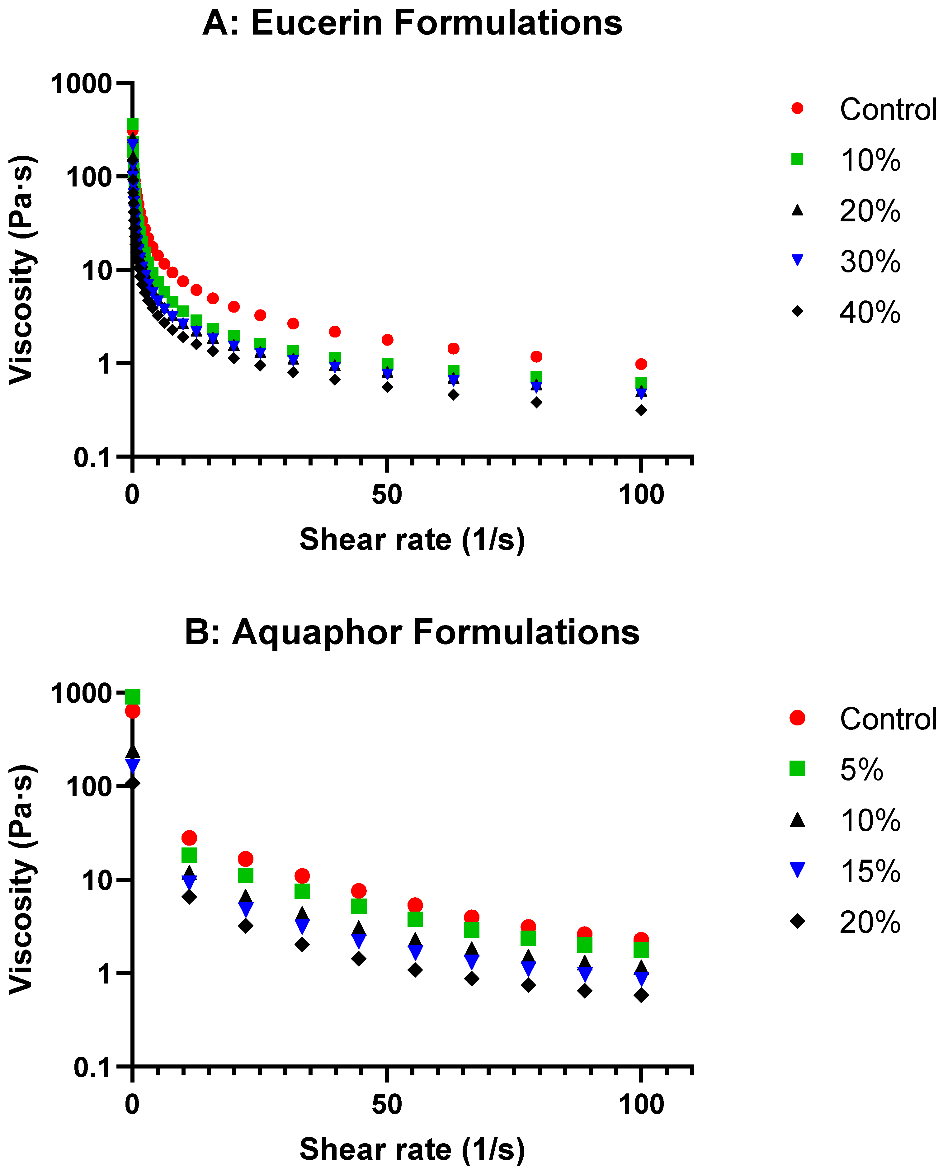 Figure 1. Viscosity values at representative shear rates for both Eucerin and Aquaphor formulations are summarized in
