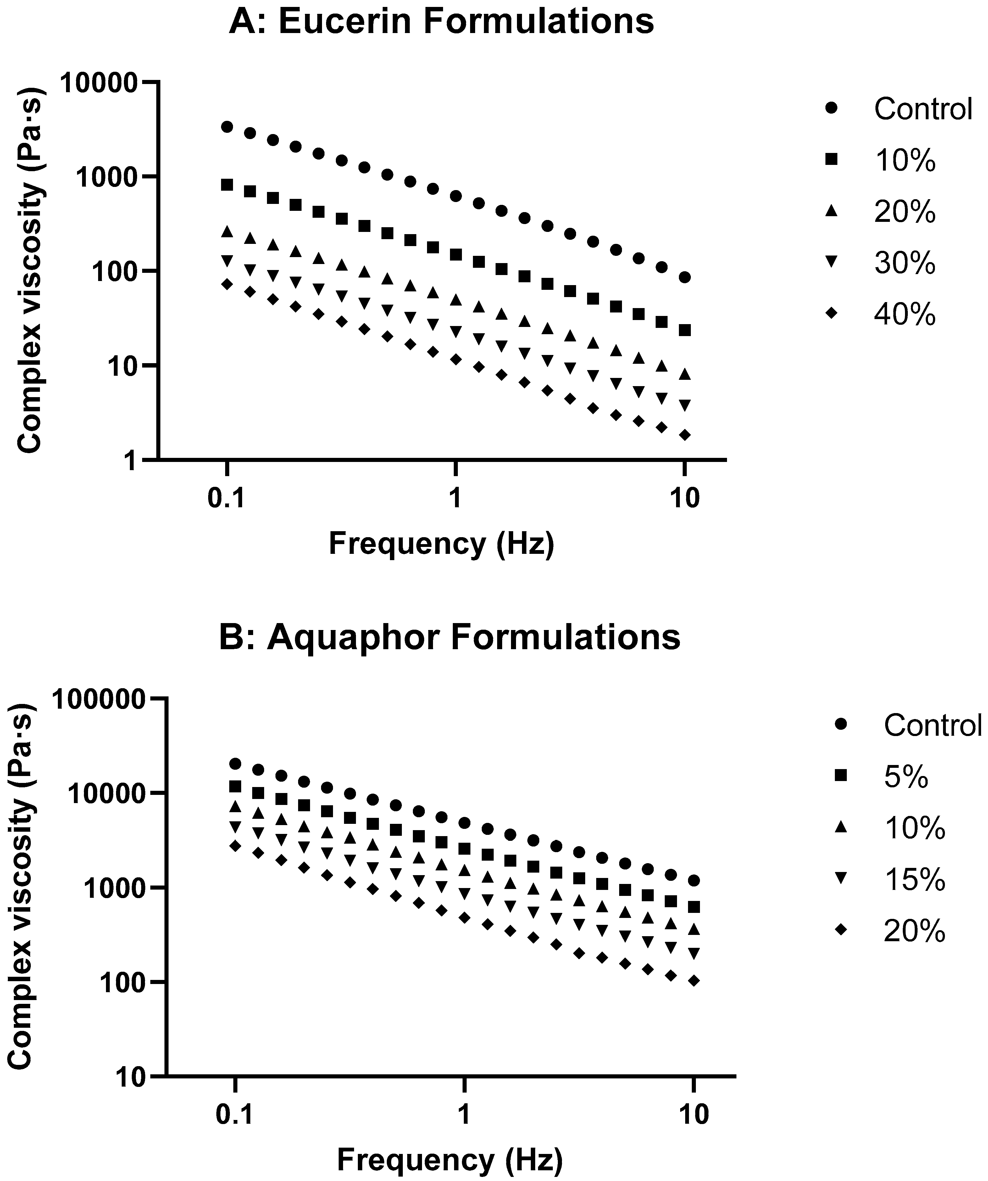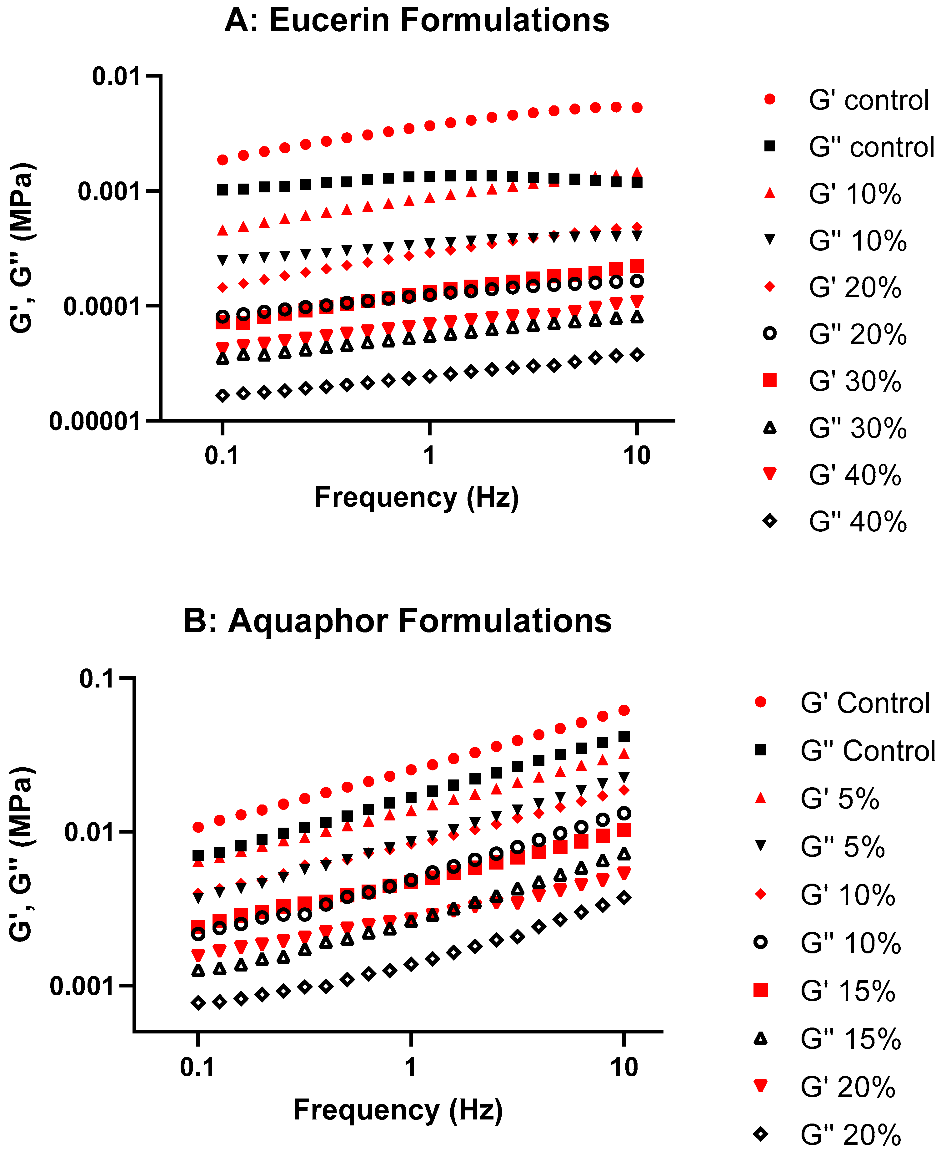 Oscillation amplitude sweep tests were first performed from 0.1 to 100 Pa at an oscillatory frequency of 1 Hz to determine the linear viscoelastic region for each formulation. Eucerin formulations included Eucerin control, Eucerin 10%, Eucerin 20%, Eucerin 30%, and Eucerin 40%; Aquaphor formulations included Aquaphor control, Aquaphor 5%, Aquaphor 10%, Aquaphor 15%, and Aquaphor 20%. The linear viscoelastic ranges for Eucerin and Aquaphor formulations were 0.5–10 Pa and 2–15 Pa, respectively.
