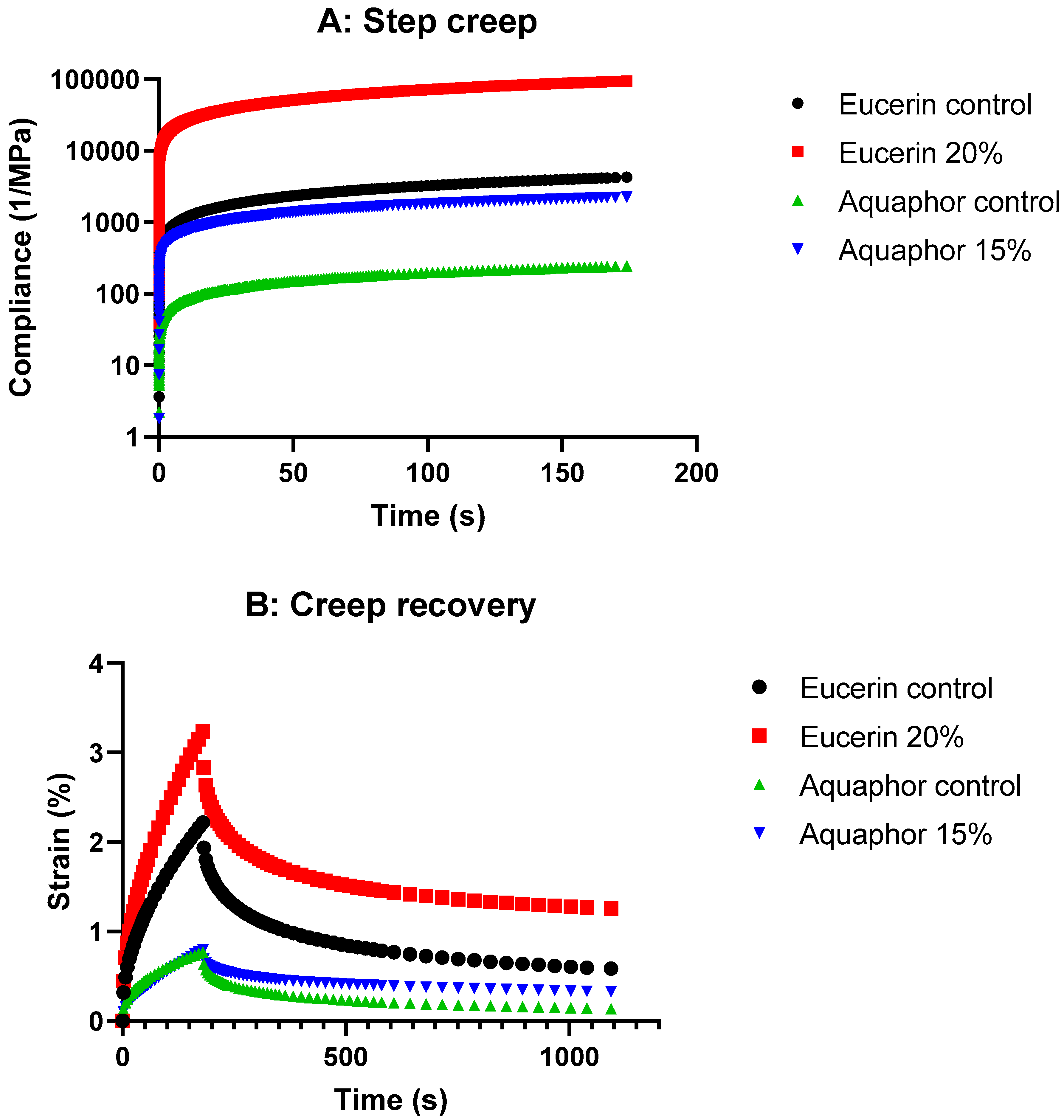 Creep measurements were conducted in step creep mode for Eucerin control, Eucerin 20%, Aquaphor control, and Aquaphor 15% formulations. The stress representative of the linear viscoelastic region was applied, i.e., 5 Pa for Eucerin control, 0.5 Pa for Eucerin 20%, 15 Pa for Aquaphor control, and 2 Pa for Aquaphor 15%. The compliance values were obtained as functions of time (